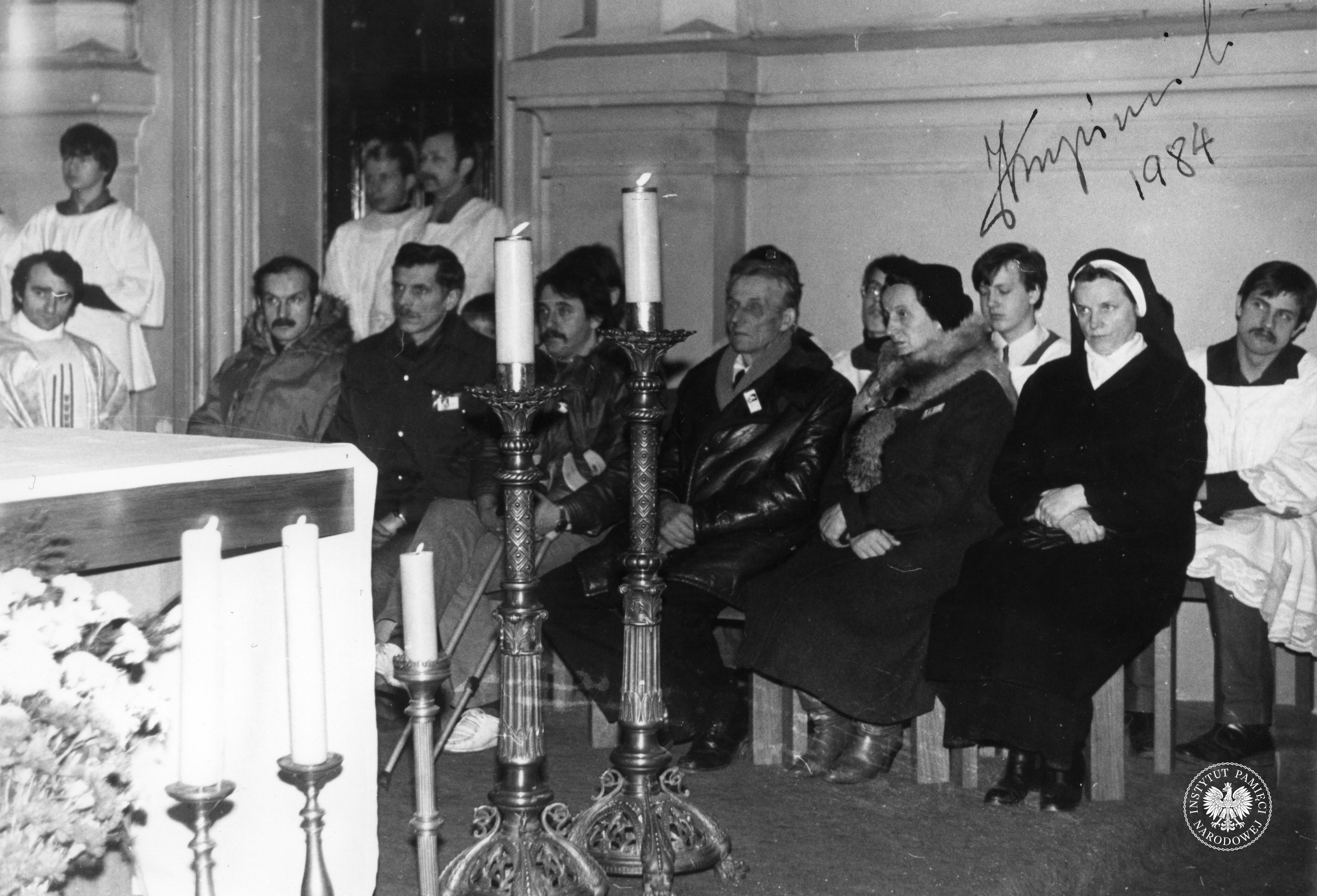 Na fotografii uczestnicy uroczystości w kościele. W pierwszym rzędzie widać siedzącą rodzinę ks. Popiełuszki (druga od prawej to siostra ks. Popiełuszki, trzeci od prawej - Władysław Popiełuszko) oraz łódzkich opozycjonistów - Andrzeja Słowika (piąty od prawej) oraz Jerzego Kropiwnickiego (szósty od prawej). (fot. AIPN)