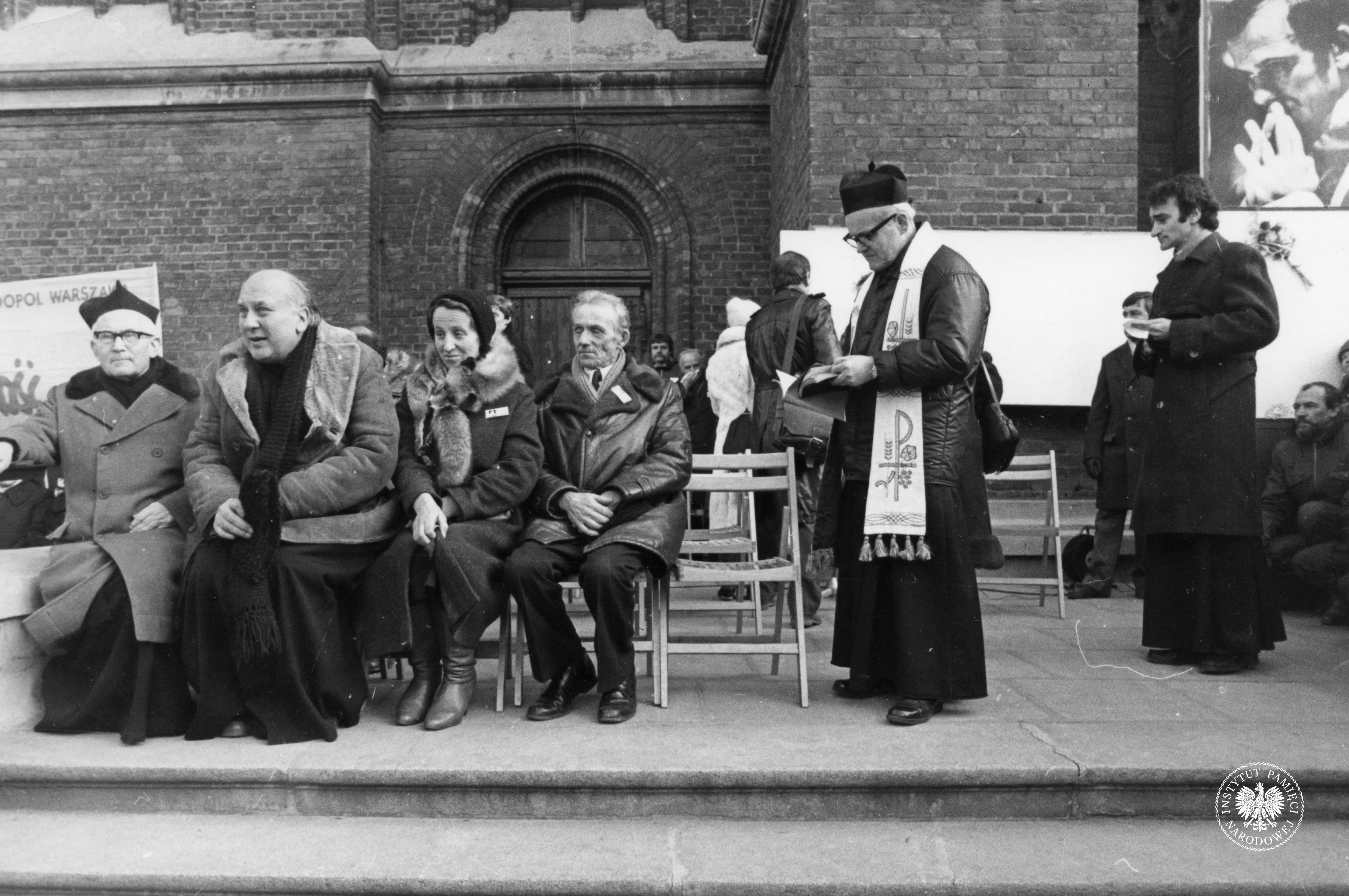 Fotografia wykonana przed kościołem, na krzesłach widać siedzącą rodzinę ks. Jerzego Popiełuszki – ojca Władysława i siostrę ks. Jerzego. Po prawej stronie, z założoną stułą, stoi o. Stefan Miecznikowski (jezuita, kapelan łódzkiej "Solidarności"). (fot. AIPN)