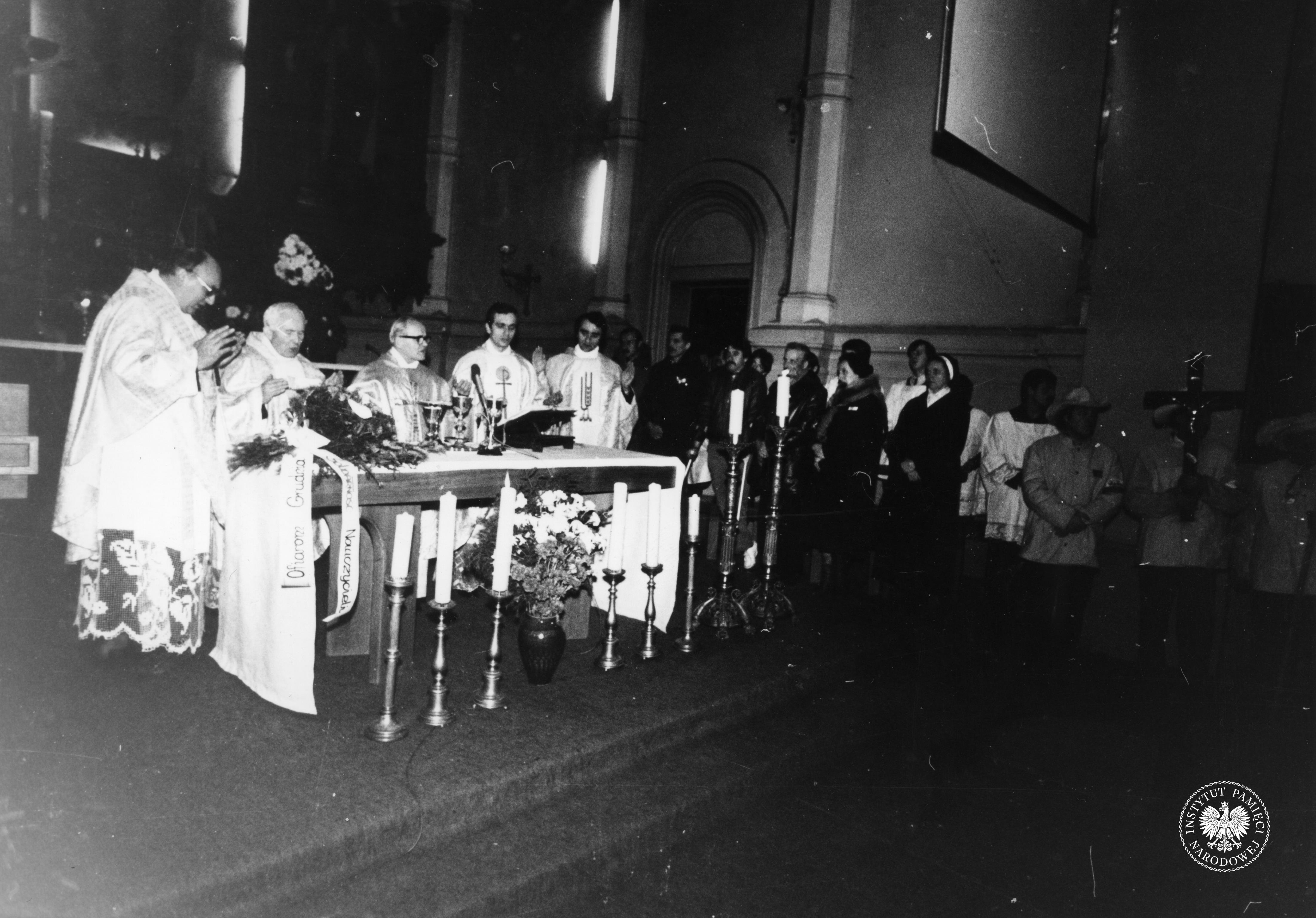 Fotografia przedstawia ludzi zgromadzonych w kościele. Widać transparent o treści: "Męczeńska śmierć ks. Jerzego wycisnęła trwałe i niezatarte piętno w sercach naszych. Niech ból ten przemieni się w nadzieję - wierność prawdzie, odwagę i męstwo. Zarząd pracownicy NSZZ Solidarność Ziemi Łódzkiej." (fot. AIPN)