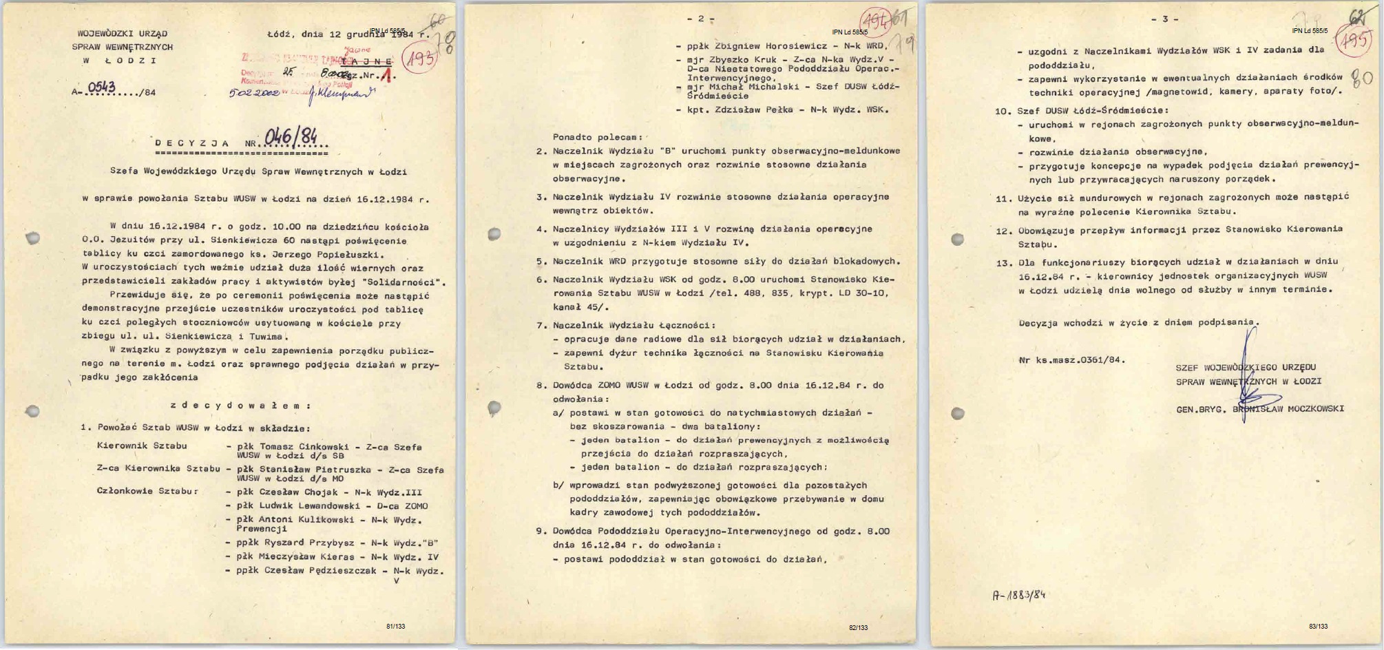 Decyzja Szefa Wojewódzkiego Urzędu Spraw Wewnętrznych w Łodzi w sprawie powołania Sztabu WUSW w Łodzi na dzień 16 grudnia 1984 г. (z zasobu AIPN)
