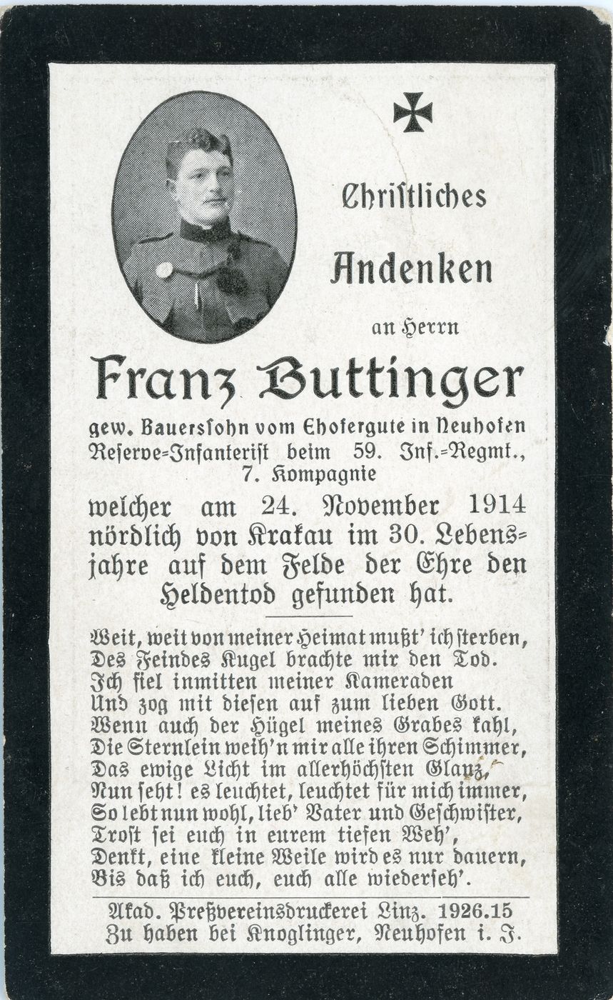 „Z tego powodu, że Moskale chcieli się osadzić z armatami na Gaju i na Kaimie, nasza artyleria chcąc temu przeszkodzić biła w te miejsca, że aż jęczało, [...] Po opuszczeniu więc wojsk austriackich Bieżanowa i okolicy i zamknięciu bram Twierdzy Krakowa, od 27 względnie 28 listopada 1914 roku ulokowali się Moskale w Bieżanowie, ale tylko na Gaju (we wsi nie mieli odwagi i [z] powodu bliskości »drutów«). Przez dziewięć dni była strzelanina, raz mniejsza między patrolami, lecz nigdzie w tym miejscu do żadnej większej potyczki nie przyszło i sama tylko artyleria nasza trzymała Moskali w należytym oddaleniu od Krakowa. Z cywilnej ludności pomimo strzałów armatnich na Bieżanów i Kajm, nawet ranny nikt nie został”