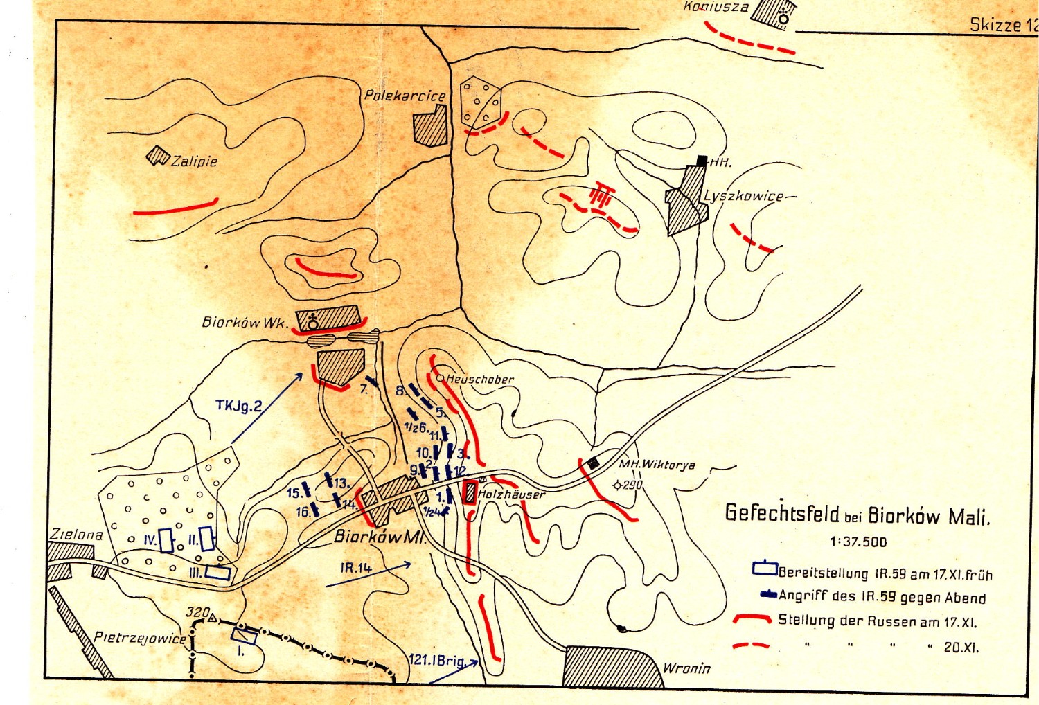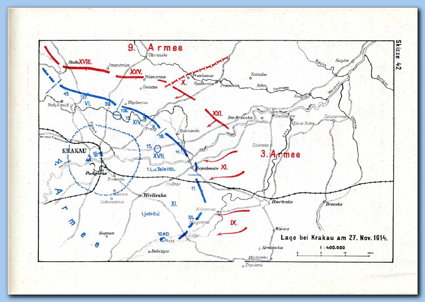 Sytuacja w rejonie Krakowa 27 listopada 1914 r. Źródło mapy: E. Glaise von Horstenau, Österreich-Ungarns letzter Krieg 1914-1918. 1. Das Kriegsjahr 1914. I Bailagen, Wien 1932