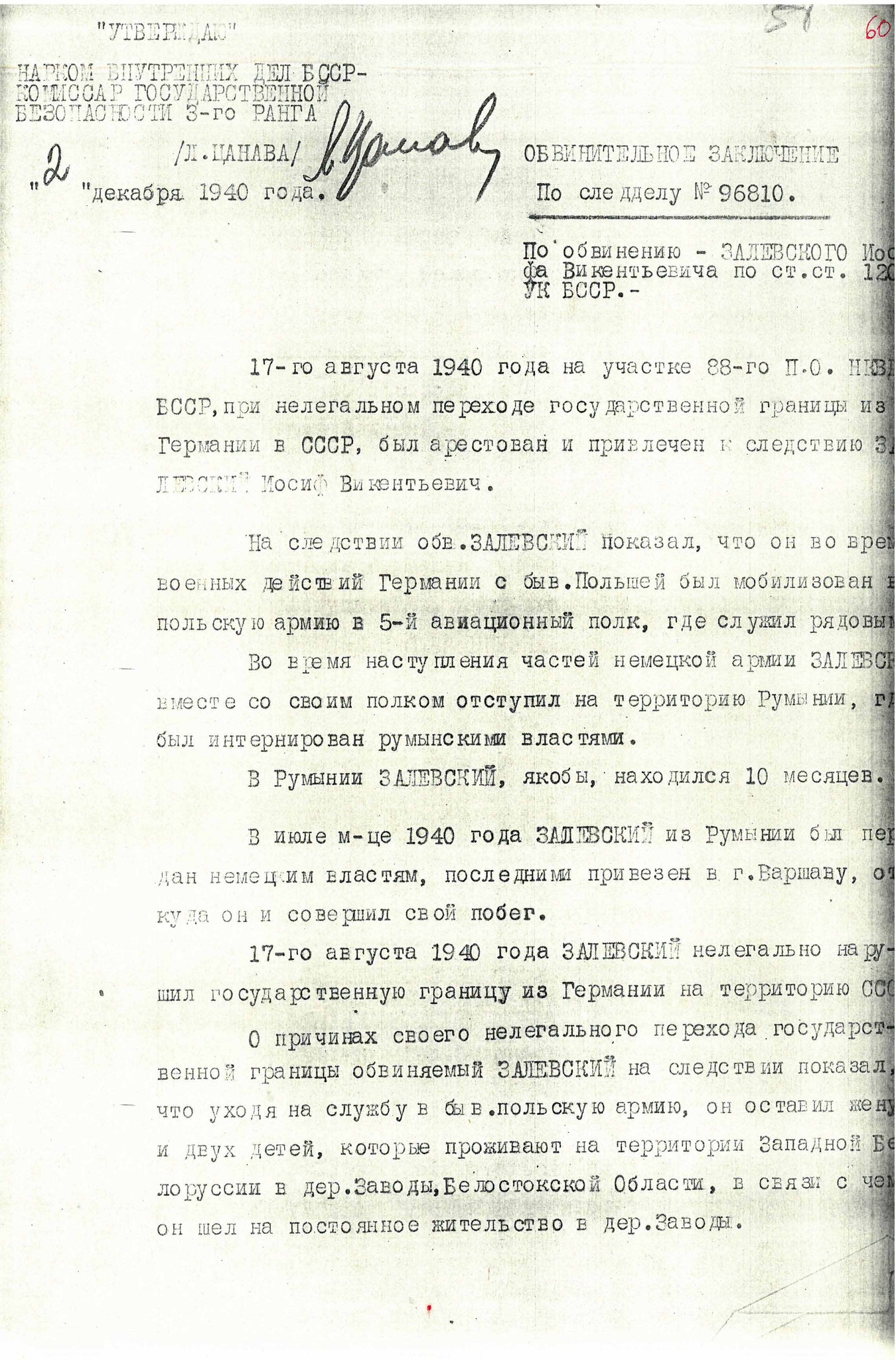 Postanowieniem z 18 czerwca 1941 r. Zalewski został skazany na 3 lata łagru.