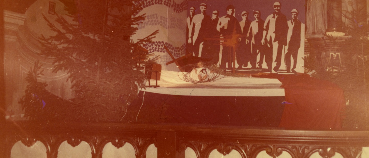 Żłóbek umieszczony został w bocznym ołtarzu. Główne tło stanowiła grupa górników z kopalni „Wujek”, w którą wdzierała się krew, spływająca z obrazu aż na sam jego dół i przechodząca dalej w czerwień tkaniny spływającej na ołtarz i dalej, do stopni ołtarza. W górze była twarz Matki Boskiej Częstochowskiej z wielką krwawą łzą. Z lewej strony biała płyta na której niby na śniegu – wymalowane ślady transporterów i czołgów. U jej stóp przewrócony żłóbek, a Pan Jezus wrzucony na zwój kolczastych drutów.