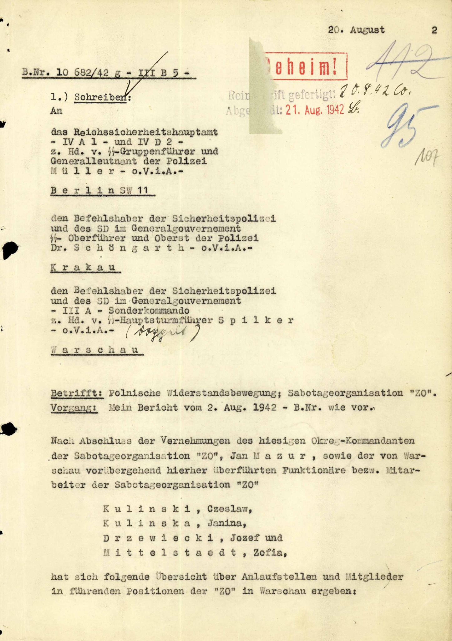 Dokumenty ze śledztw prowadzonych przez okupacyjne niemieckie tajne służby policyjne przeciwko „Związkowi Odwetu”, 1942 r. Materiały pochodzą z zespołu: „Der Kommandeur der Sicherheitspolizei und des SD für den Distrikt Radom” [Komendant Policji Bezpieczeństwa i Służby Bezpieczeństwa dla Dystryktu Radomskiego], przechowywanego w zasobie Archiwum IPN w Warszawie