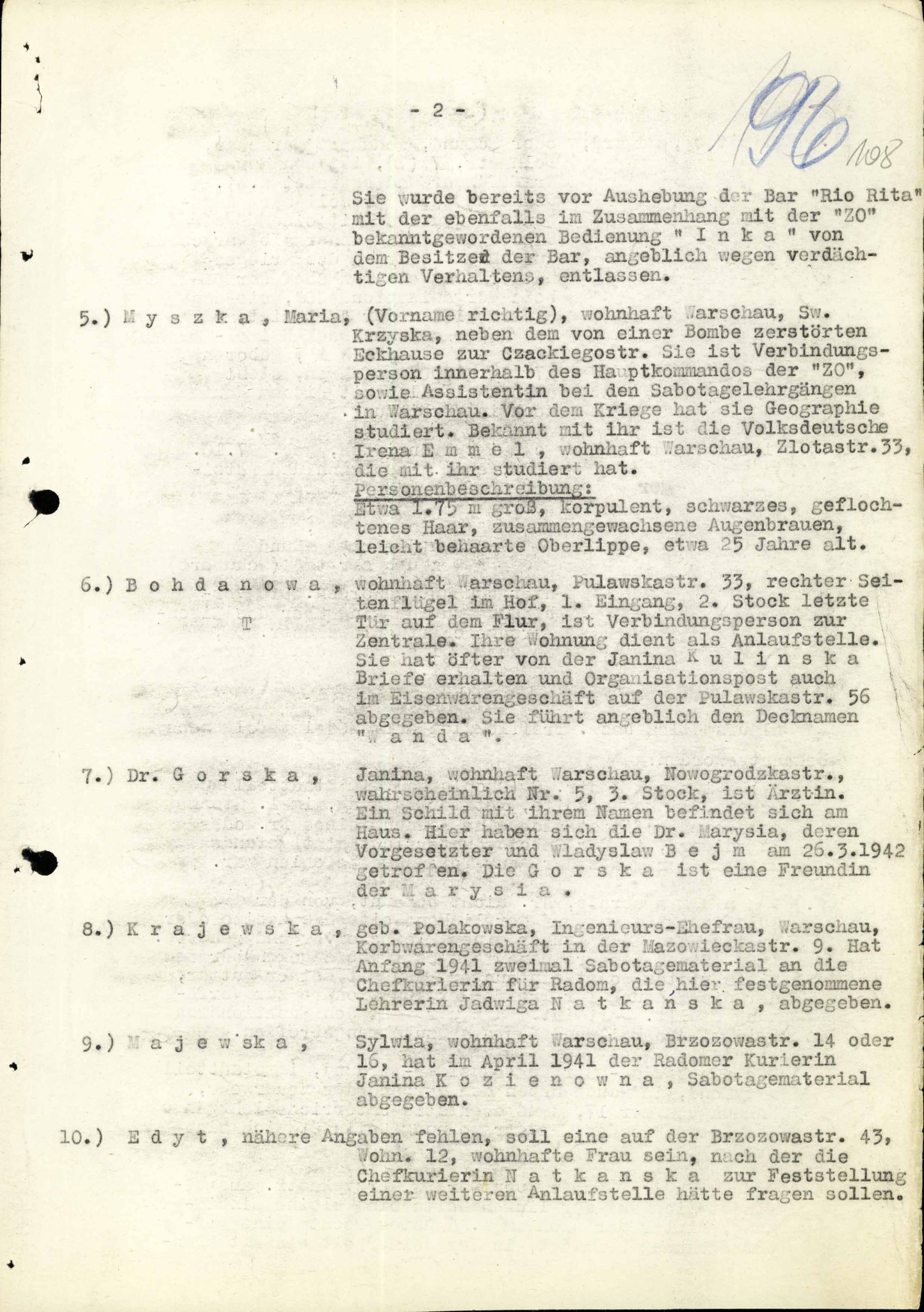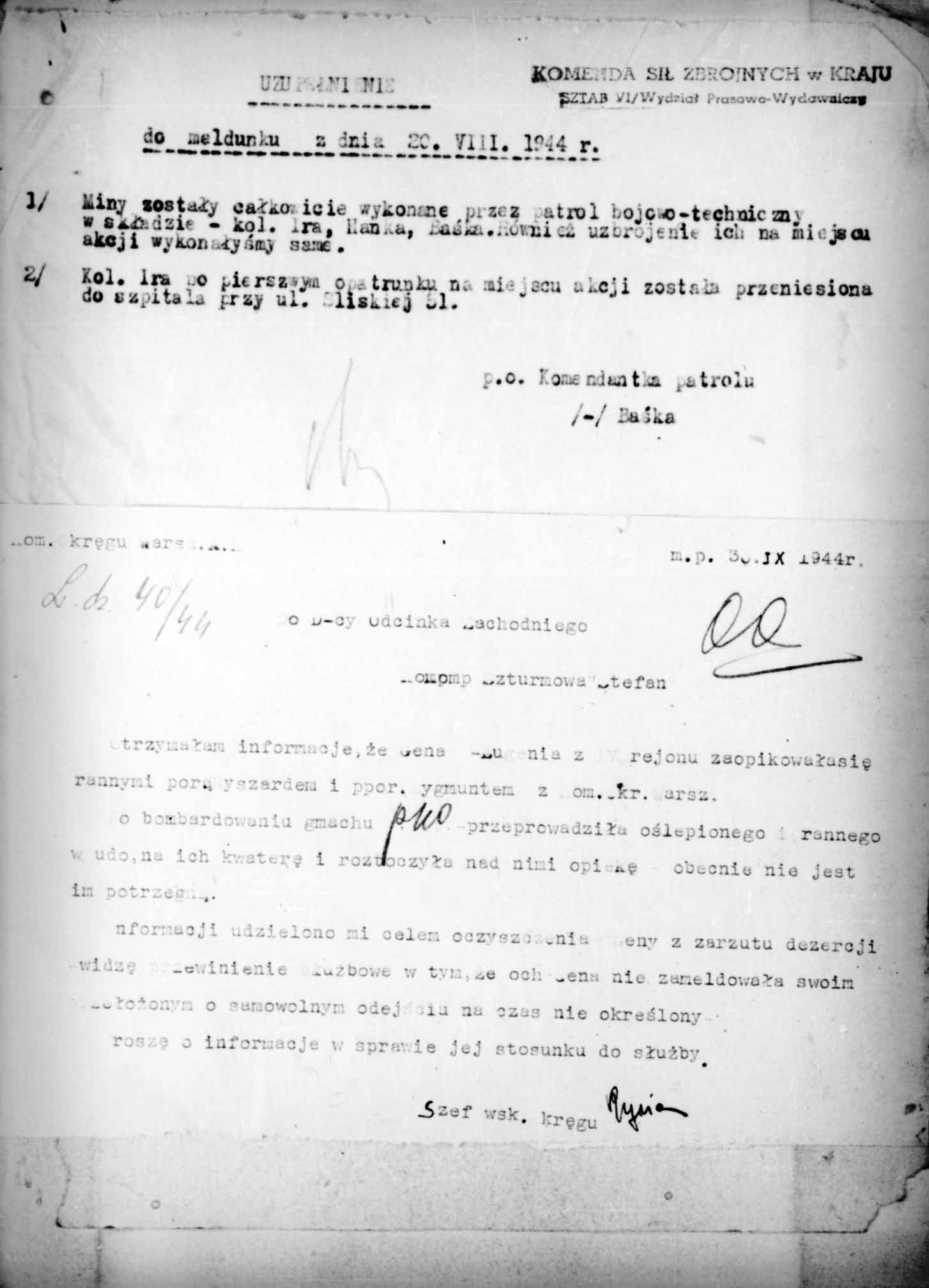 Raport (i jego uzupełnienie) dotyczący jednej z akcji minerskich AK z udziałem kobiet-żołnierzy, przeprowadzonej nocą z 19 na 20 sierpnia 1944 r. w ramach operacji zdobywania przez AK gmachu tzw. PAST-y. Dokument pochodzi z akt Ministerstwa Bezpieczeństwa Publicznego w Warszawie zawierających mikrofilmy dokumentów dotyczących m.in. przebiegu i organizacji walk powstańczych w Warszawskim Okręgu AK w ramach akcji „Burza"