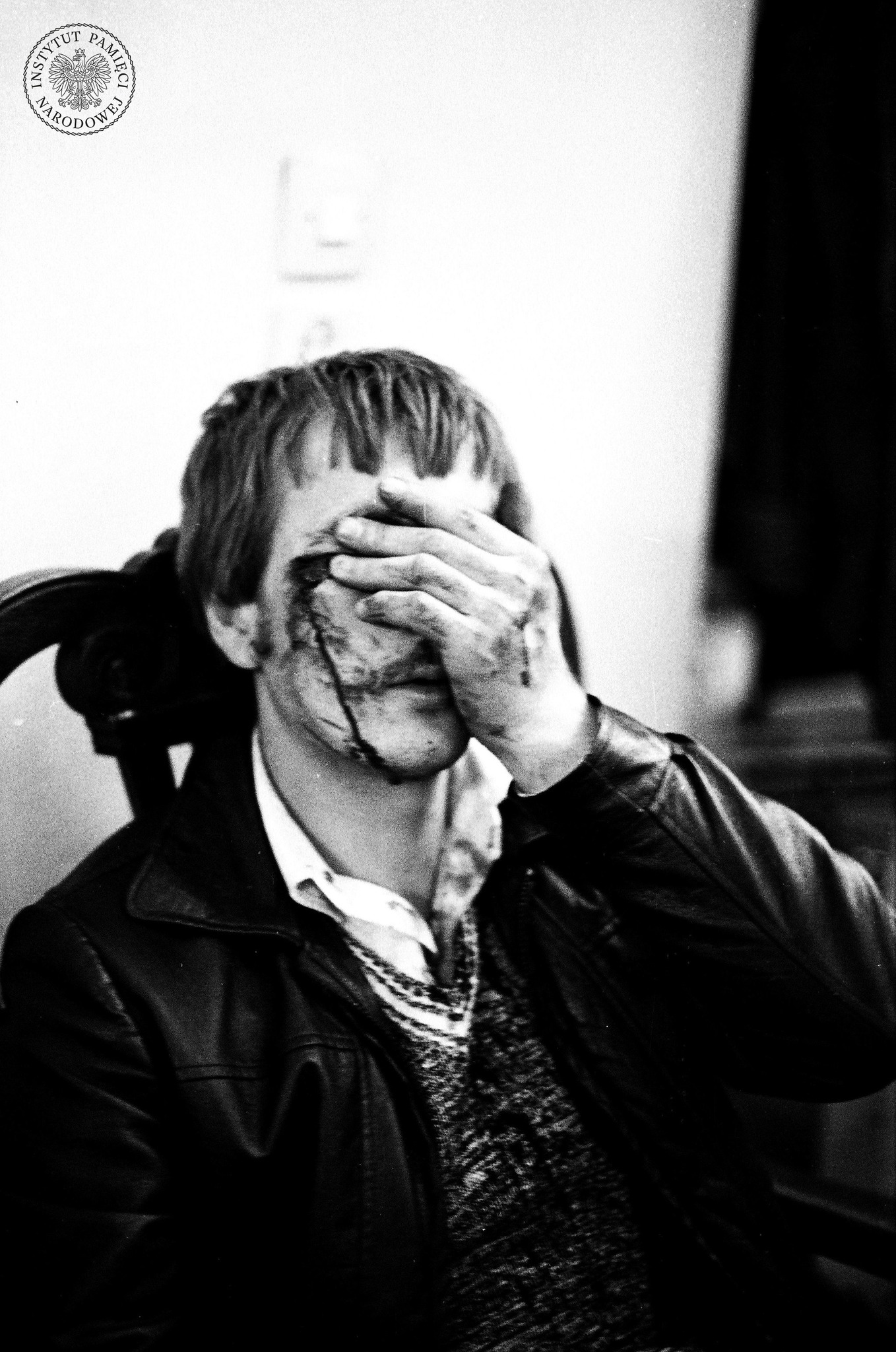 Wprowadzenie stanu wojennego w Gdańsku. Zakrwawiony mężczyzna prawdopodobnie po starciu z funkcjonariuszami Milicji Obywatelskiej. Fot. Stanisław Składanowski (fot. z zasobu IPN)