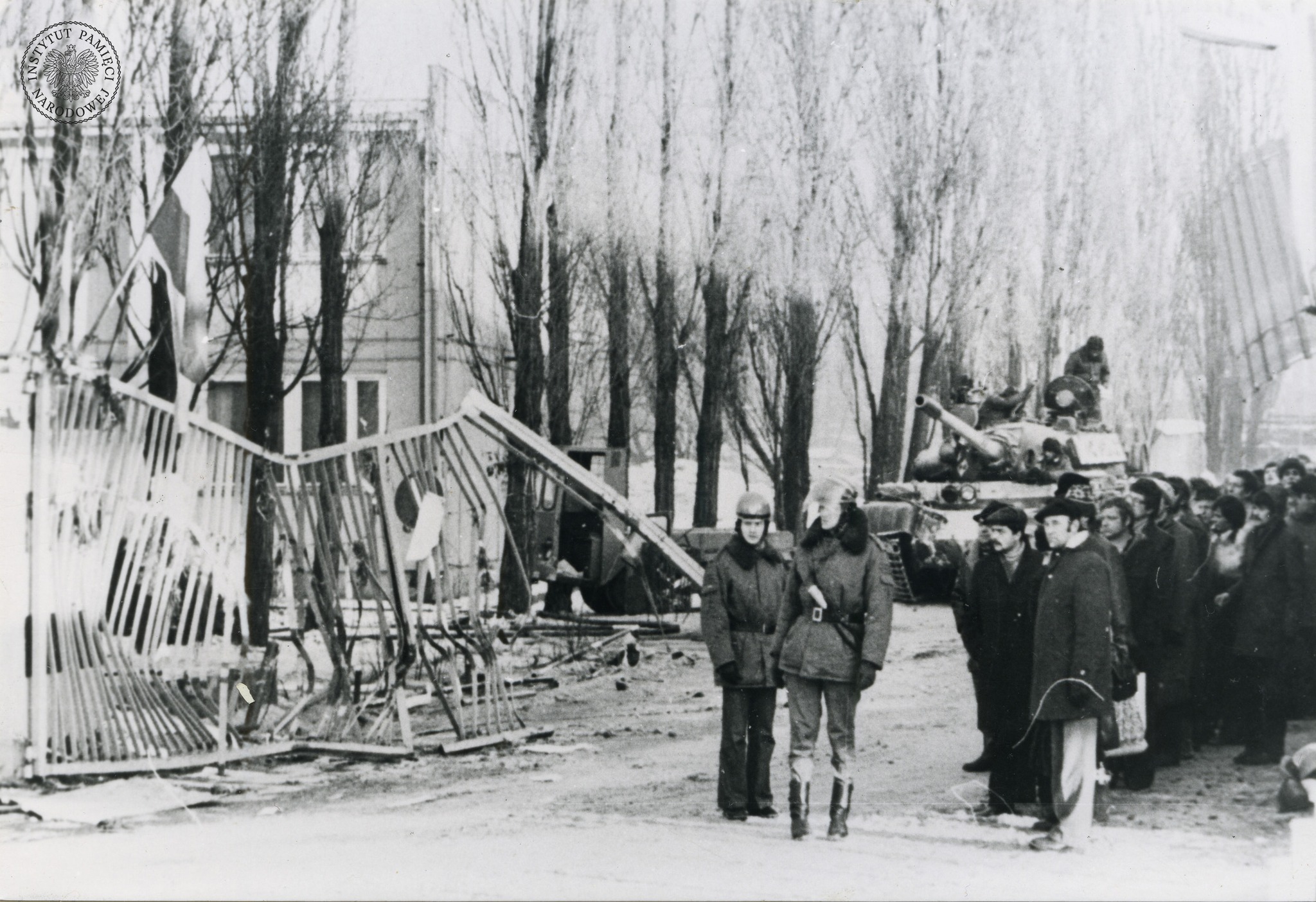 Strajk w Stoczni Gdańskiej im. Lenina w grudniu 1981 r. Brama nr 2 Stoczni Gdańskiej im. Lenina. W centralnej części fotografii otwarta brama stoczni z widocznym zniszczonym skrzydłem. Pod budynkiem przy bramie widać szpaler ludzi. Przy nich dwaj milicjanci w hełmach, jeden z przezroczystą przyłbicą. Na budynku zerwany, zwisający fragment poszycia. Na dalszym planie widoczny czołg T55 stojący przodem w kierunku wylotu bramy (fot. z zasobu IPN)
