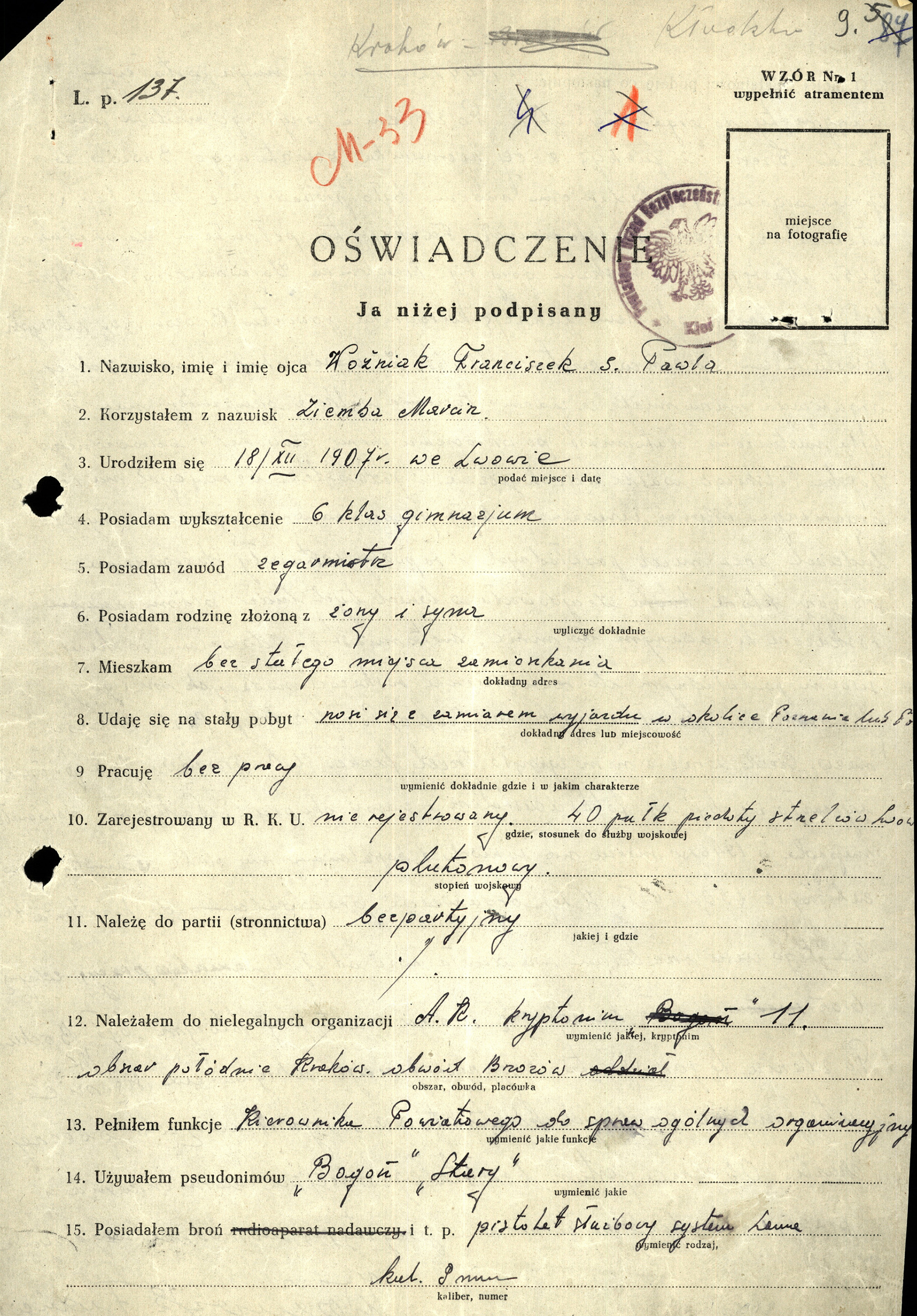 To w nim podał swoje dane osobowe tj. imię i nazwisko, datę urodzenia, imię ojca, zawód, stopień wojskowy, pseudonimy i nazwiska konspiracyjne których używał, krótki przebieg działalności itd. Nie mamy jednak pewności, czy napisane przez niego informacje były prawdziwe? Pomimo upływu lat i coraz większej dostępności archiwów oraz ich cyfryzacji, poszukiwań jego rodziny, nie udało się ustalić dalszych jego losów i pełnych danych biograficznych. Oto jego historia.