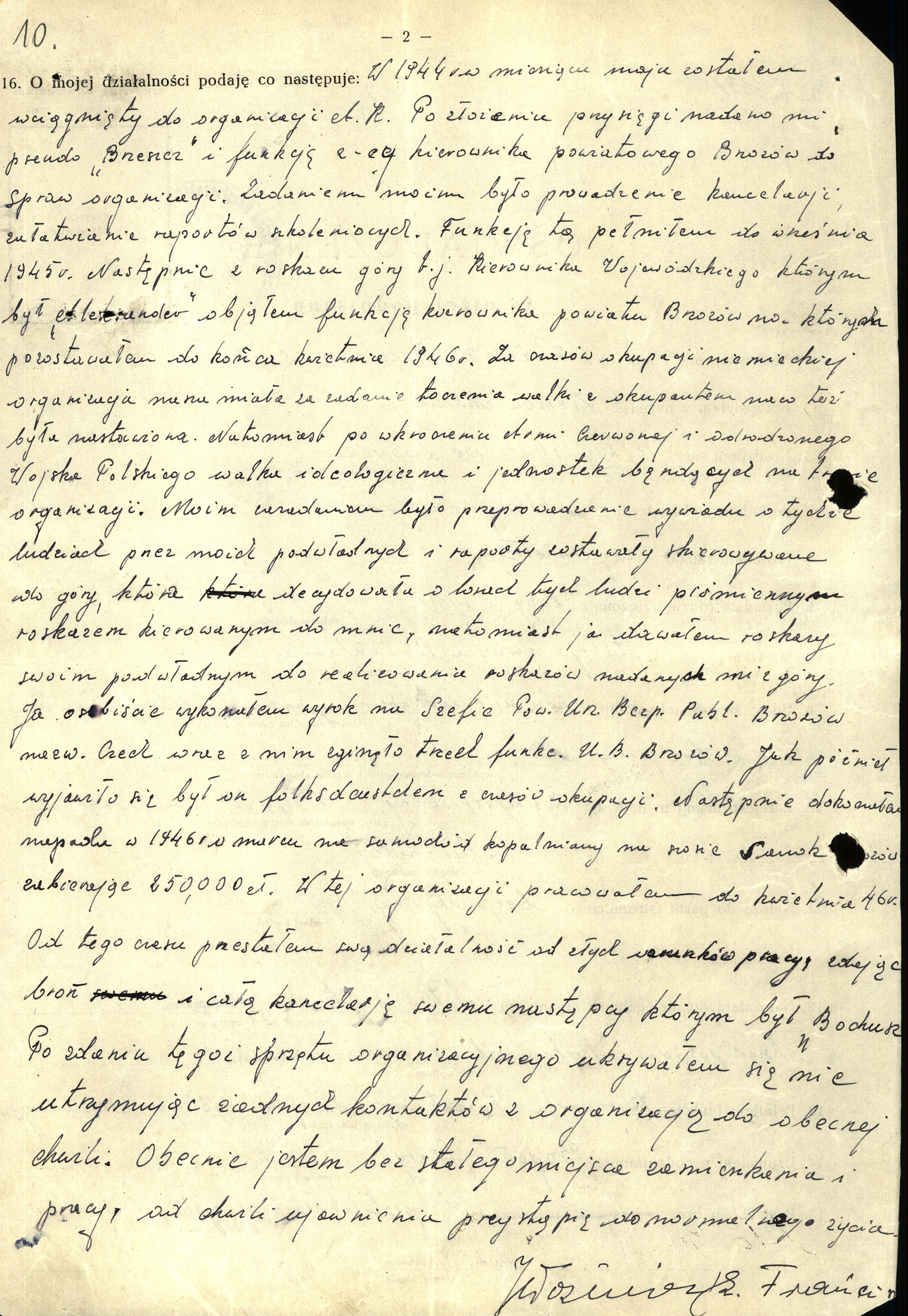 „Ja osobiście wykonałem wyrok na szefie PUBP Brzozów nazw. Czech, wraz z nim zginęło trzech funkc[jonariuszy] UB Brzozów. Jak później wyjawiło się był on folksdojczem w czasie okupacji. Następnie dokonałem napadu w [kwietniu] 1946 r. […] na samochód kopalniany na szosie Sanok – Brzozów zabierając 250 tys. zł”.