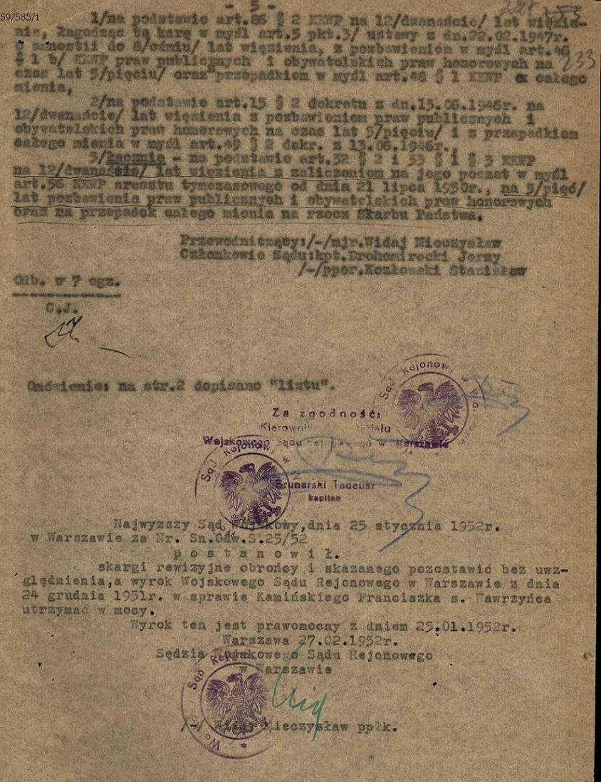 Sąd uznał go za winnego popełnienia przestępstwa z art. 86§2 KKWP (uczestniczenia w nielegalnych organizacjach mających na celu usiłowanie przemocą zmiany „ludowo-demokratycznego ustroju Państwa Polskiego”) oraz przestępstwa z art. 7 w związku z art. 15§2 dekretu z 13 czerwca 1946 r. (zbieranie wiadomości stanowiących tajemnicę wojskową i państwową oraz przekazywanie ich Stanisławowi Mikołajczykowi i organizacji WiN). Franciszka Kamińskiego skazano za czyny, których nie popełnił.