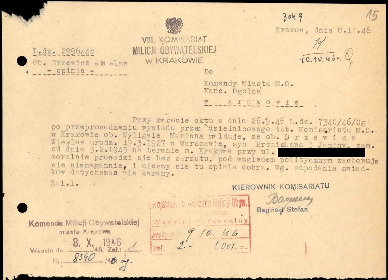 1 września 1946 roku Wiesław Drzewicz został zatrudniony w 6. Komisariacie Milicji Obywatelskiej w Krakowie jako cywilny pracownik na etacie instruktora polityczno-wychowawczego, aby prowadzić amatorskie kółko teatralne w domu kultury. Zwolniono go po pięciu miesiącach 30 stycznia 1947 roku.