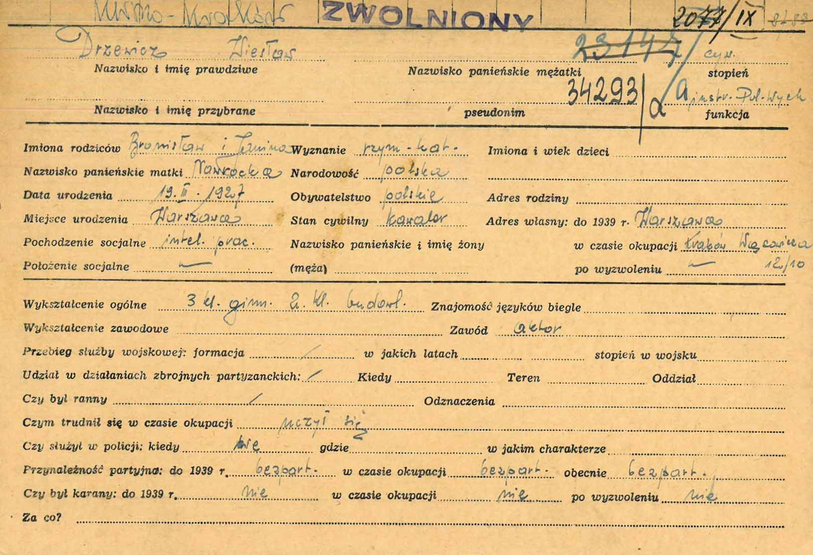 W zasobie Instytutu Pamięci Narodowej znajdują się dokumenty archiwalne stanowiące źródło wiedzy o życiu prywatnym i zawodowym tego niezwykłego aktora: akta personalne funkcjonariusza MO oraz akta paszportowe. Wiesław Drzewicz figuruje również, jako aktor bądź student szkoły dramatycznej, w materiałach ewidencyjnych b. resortu spraw wewnętrznych.