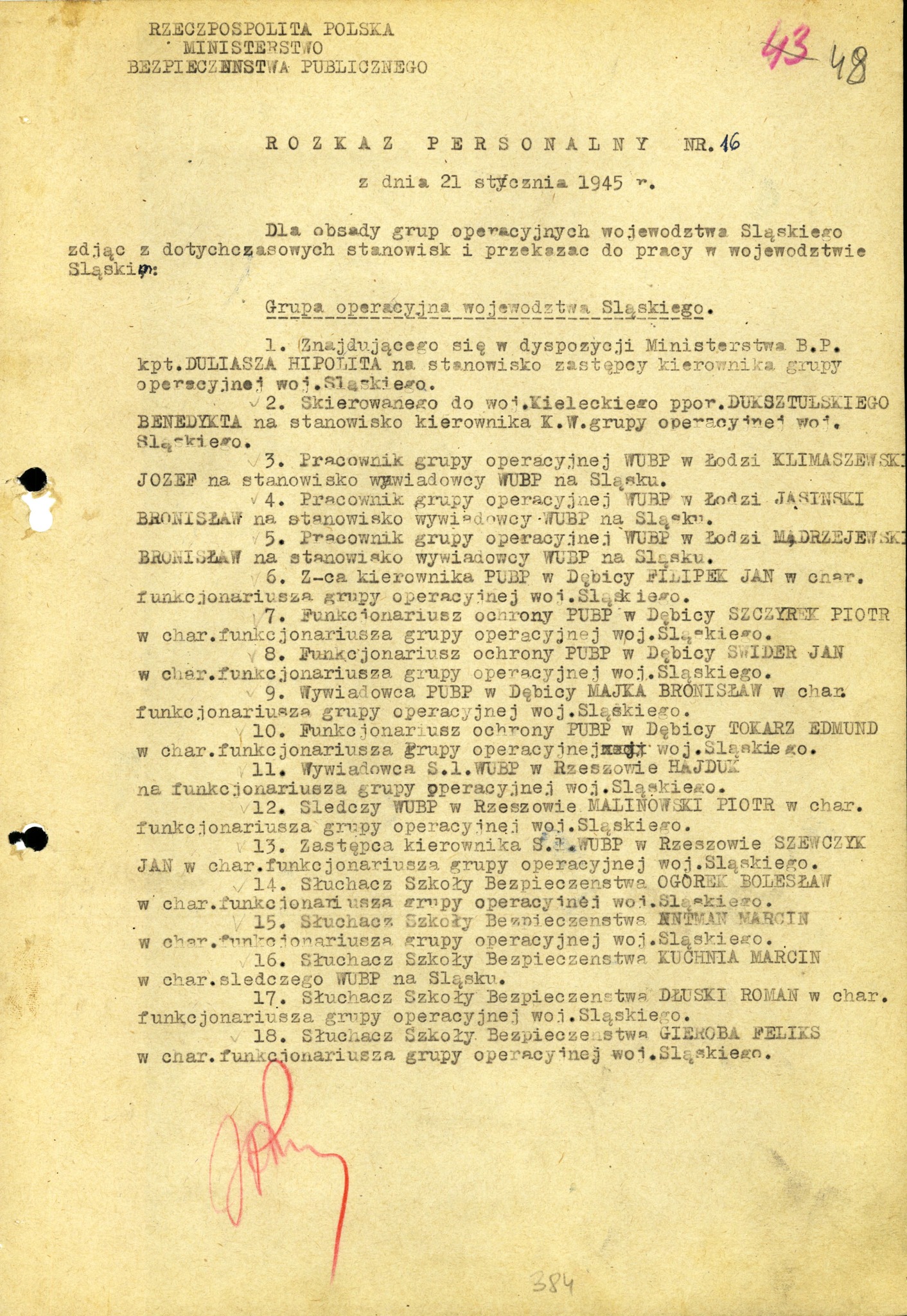 Już 10 stycznia 1945 r. Biuro Polityczne KC PPR podjęło uchwałę „O przygotowaniu aparatu bezpieczeństwa na pozostałe województwa nie wyzwolonej Rzeczpospolitej Polskiej”. W celu realizacji tych zadań utworzonych zostało siedem tzw. grup operacyjnych. Miały one zbudować struktury resortu w województwach: poznańskim, łódzkim, śląskim, krakowskim, kieleckim i pomorskim.