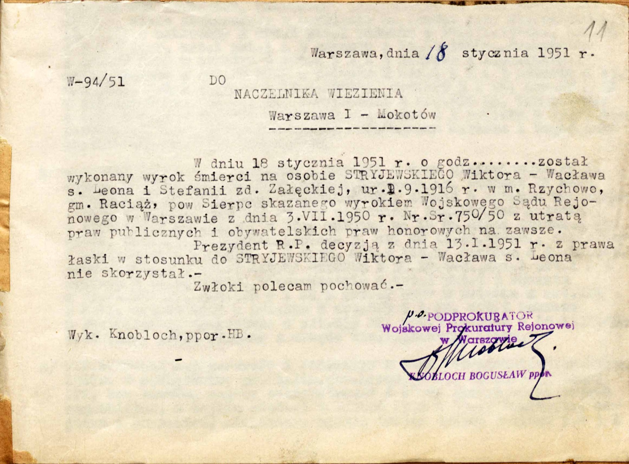 Przechowywane w Archiwum IPN w Warszawie więzienne akta osobowe skazanych w procesie sztabu 11. Grupy Operacyjnej NSZ, pochodzące ze zbioru Głównej Komisji Badania Zbrodni przeciwko Narodowi Polskiemu – Instytutu Pamięci Narodowej, w tym również akta Wiktora Stryjewskiego, zawierają m.in. pisma ppor. Bogusława Knoblocha, podprokuratora Wojskowej Prokuratury Rejonowej w Warszawie, informujące naczelnika więzienia Warszawa I – Mokotów o wykonaniu na więźniu wyroku śmierci, zakończone każdorazowo stwierdzeniem: