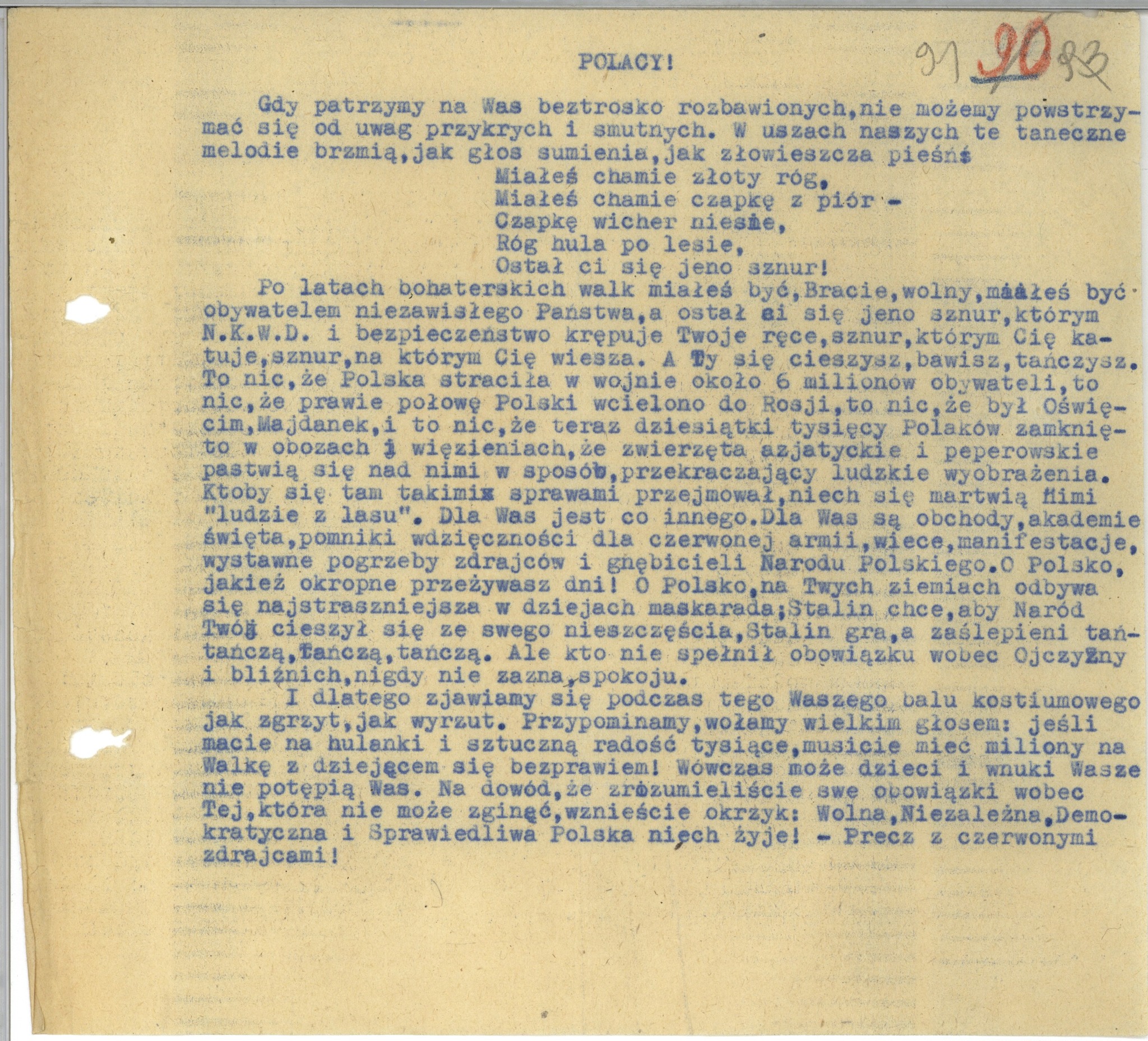 „O Polsko, na Twych ziemiach odbywa się najstraszniejsza w dziejach maskarada… I dlatego zjawiamy się podczas tego Waszego balu kostiumowego jak zgrzyt, jak wyrzut…”. Pełen goryczy, odwołujący się do „Wesela” Stanisława Wyspiańskiego, apel do sumień Polaków wystosowany przez KWP (ze zbioru IPN)