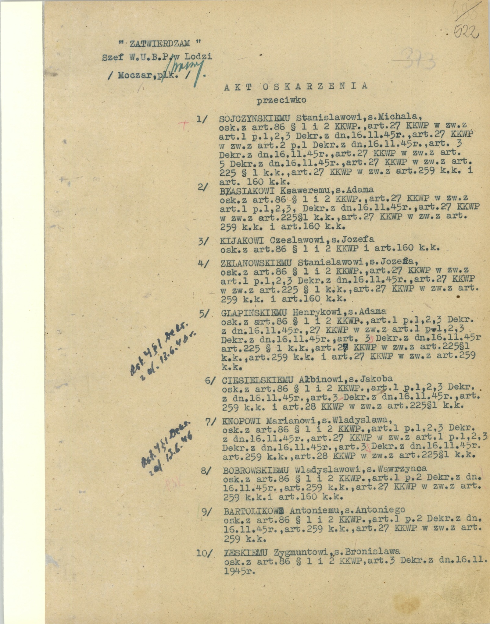 Pierwsza strona aktu oskarżenia Stanisława Sojczyńskiego i jego towarzyszy broni. Na dokumencie znajduje się podpis Mikołaja Diomki (Mieczysława Moczara), zatwierdzającego mord. Akt oskarżenia sporządził por. Frenkel z WUBP w Łodzi 23 listopada 1946 r. (ze zbioru IPN)