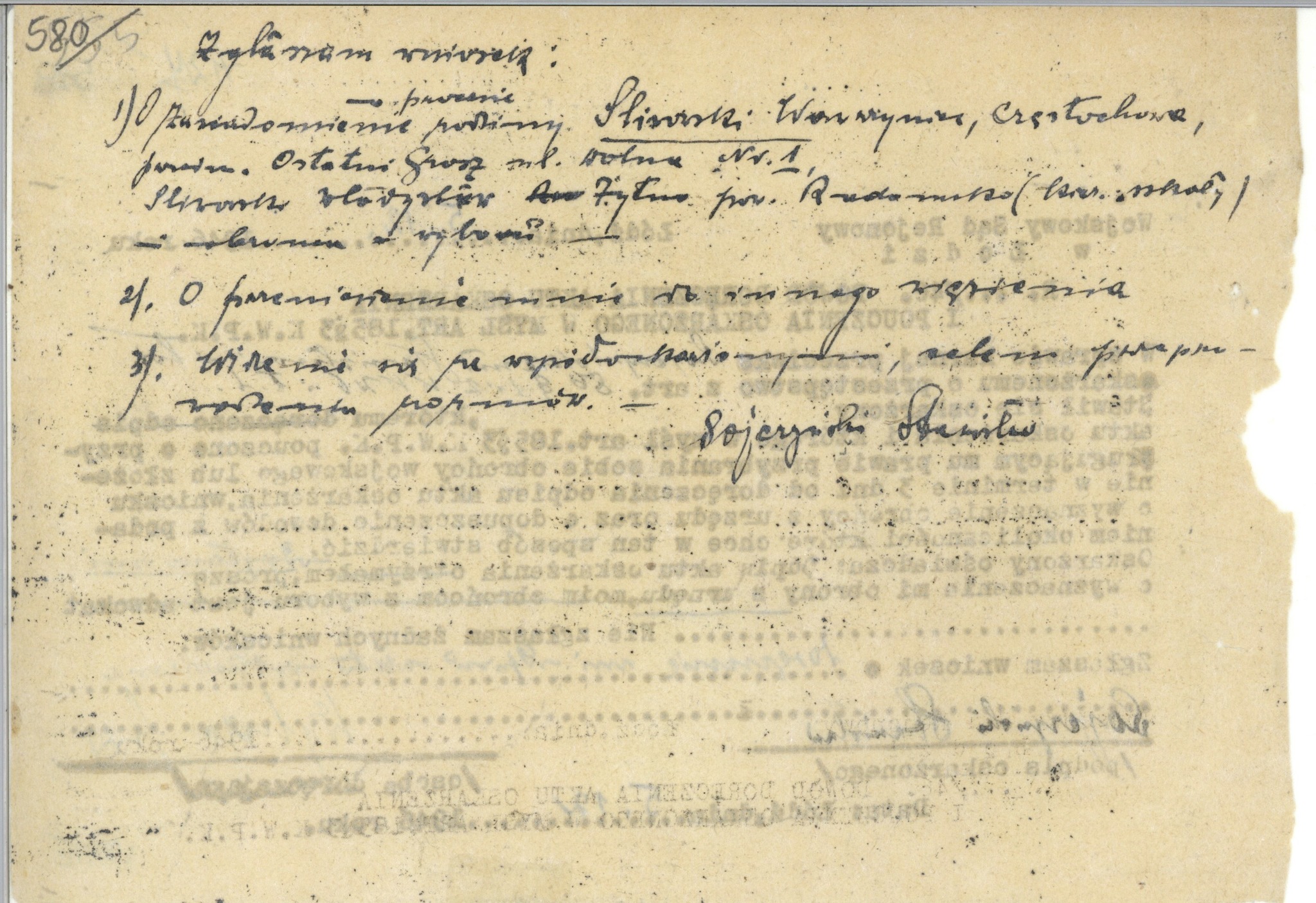 Dokument mający dowodzić doręczenie Stanisławowi Sojczyńskiemu aktu jego oskarżenia. Z odręcznych adnotacji „Warszyca” wynika, że i tę procedurę wobec niego złamano. Areszt WUBP w Łodzi, 5 grudnia 1946 r., strona pierwsza (ze zbioru IPN)