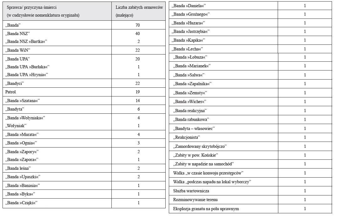 Tożsamość sprawców śmierci 264 funkcjonariuszy ORMO określana jest zasadniczo jednowyrazowo – „banda”. Tak jest w 70 przypadkach (np. „44. GODZIEBA WACŁAW. Ciechanów, chłop, ur. 15.10.1921, zm. 13.12.1946. Poległ w obronie gminy przed napadem bandy w Krasnem”6); niekiedy dookreślana organizacyjnie, najczęściej „banda NSZ” – 42 razy (np. „59. JEGLIŃSKI ADAM. Płońsk, robotnik, ur. 18.03.1908, zm. 12.05.1947. Zastrzelony w mieszkaniu przez bandę NSZ w Zawadach Starych”7); „banda WiN” – 22 przypadki (np. „164. PIETRZAK BRONISŁAW. Sieradz, chłop, ur. 8.04.1920, zm. 17.10.1947. Poległ w walce z bandą WiN we wsi Jeże-Pole, gm. Klonowa”8; „banda UPA” – 22 wpisy (np. „160. POPKO ŁUKASZ. Tomaszów Lub., chłop, ur. 1.10.1909, zm. 15.08.1947. Poległ w walce z bandą UPA we wsi Rzeczyca, gm. Tarnoszyn”9); niekiedy zaś identyfikowana pseudonimem dowódcy: „banda »Szatana«”, „banda »Wołyniaka«”, „banda »Murata«”, „banda »Ognia«” i innych (np. „31. DUDZIAK BOLESŁAW. Lubartów, chłop, ur. 2.03.1912, zm. 19.06.1946. Poległ w walce z bandą »Szatana« we wsi Charlęż, gm. Spiczyn”10).