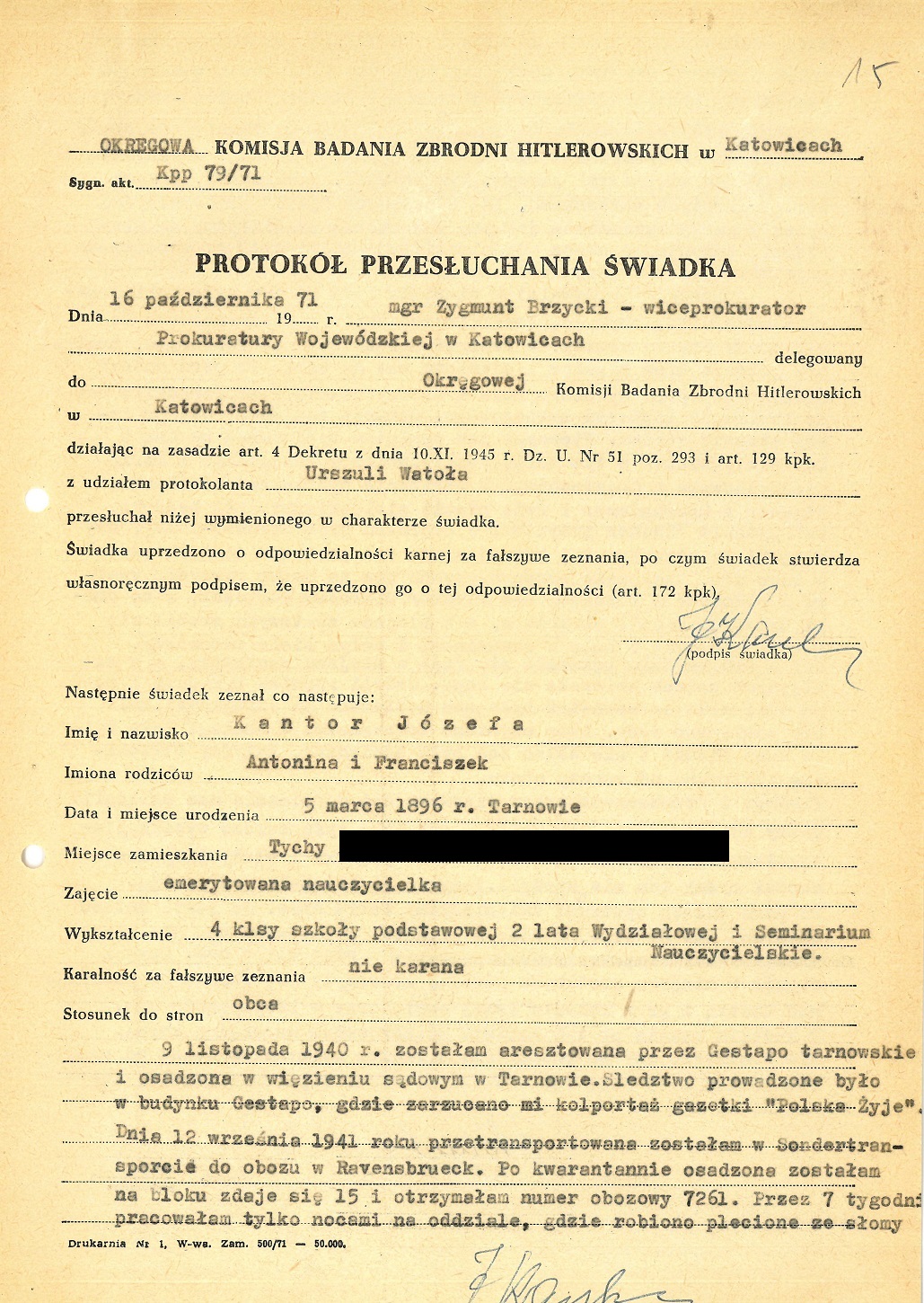 Protokół przesłuchania Józefy Kantor przez Okręgową Komisję Badania Zbrodni Hitlerowskich w Katowicach, 16 X 1971 r. Dokument pochodzi z przechowywanych w zasobie Archiwum IPN w Warszawie akt dotyczących ubiegania się Józefy Kantor o przyznanie pomocy finansowej ze względu na poddawanie eksperymentom pseudomedycznym w obozie koncentracyjnym w Ravensbrück w latach II wojny światowej (z zasobu IPN)