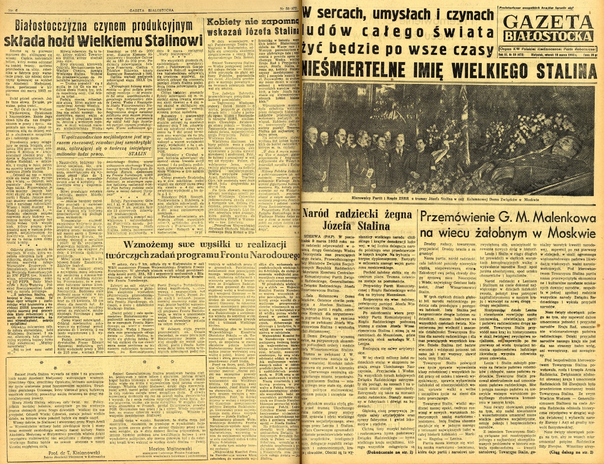 2 Białostocczyzna czynem produkcyjnym składa hołd Wielkiemu Stalinowi, „Gazeta Białostocka”, 9 III 1953.
