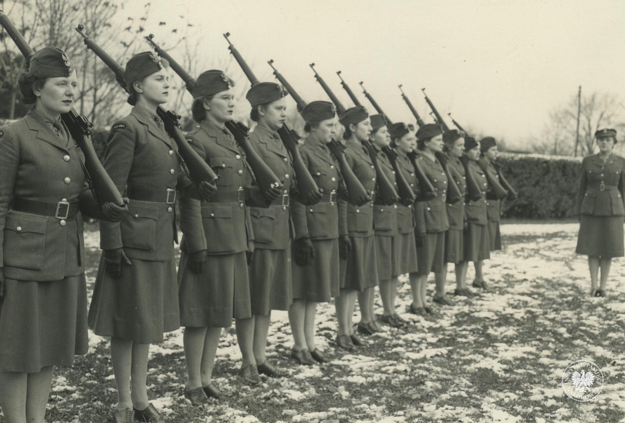 Ochotniczki z jednostki pomocniczej Polskich Sił Zbrojnych podczas musztry z bronią w obozie szkoleniowym prawdopodobnie w Wielkiej Brytanii. Odbitka rozpowszechniana przez komórki propagandy Rządu RP na uchodźstwie, pochodząca z kolekcji Teresy Mellerowicz-Gelli (fot. z zasobu AIPN)