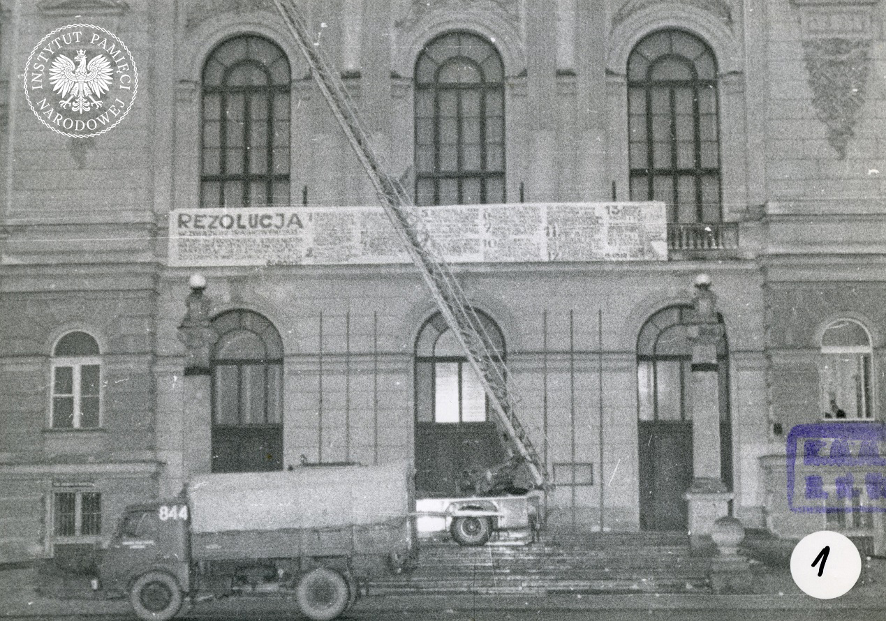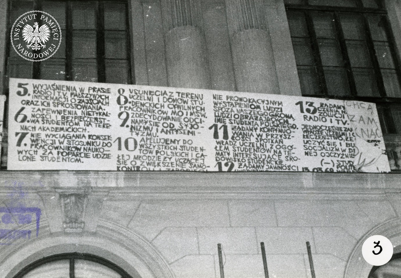 Fragment rezolucji przyjętej przez studentów Politechniki Warszawskiej na wiecu 13 marca 1968 r., umieszczony na fasadzie Gmachu Głównego PW, 23 III 1968 r. Zdjęcie wykonane przez por. M. Wawrzyniaka i por. R. Końskiego, funkcjonariuszy z Laboratorium Kryminalistyki Komendy MO m.st. Warszawy (fot. z zasobu IPN