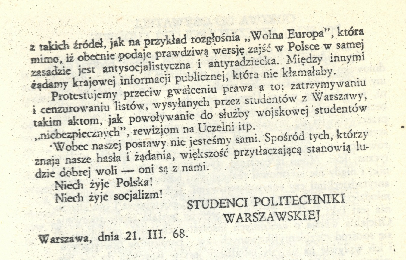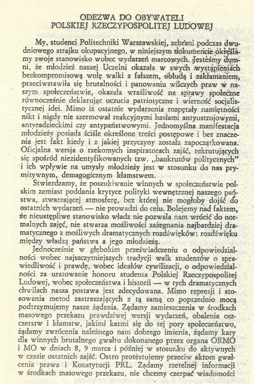 Tekst odezwy studentów Politechniki Warszawskiej do obywateli Polskiej Rzeczypospolitej Ludowej, 21 III 1968 r. (w: Marzec 1968, część II, wyd. NZS Politechniki Warszawskiej , 1981 r.)