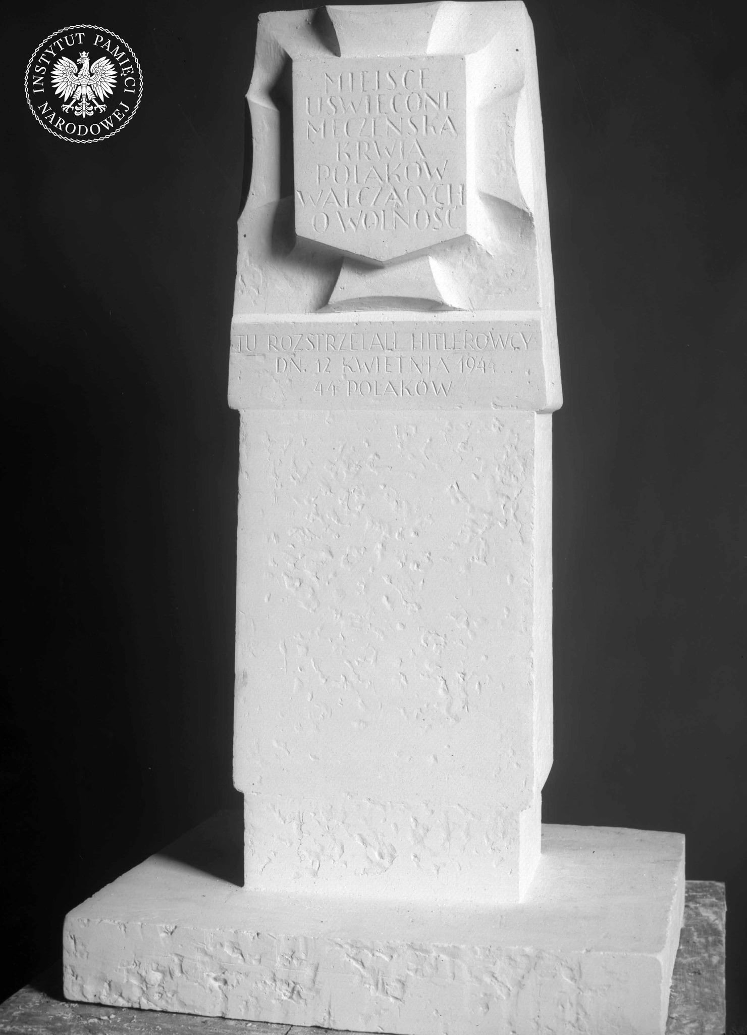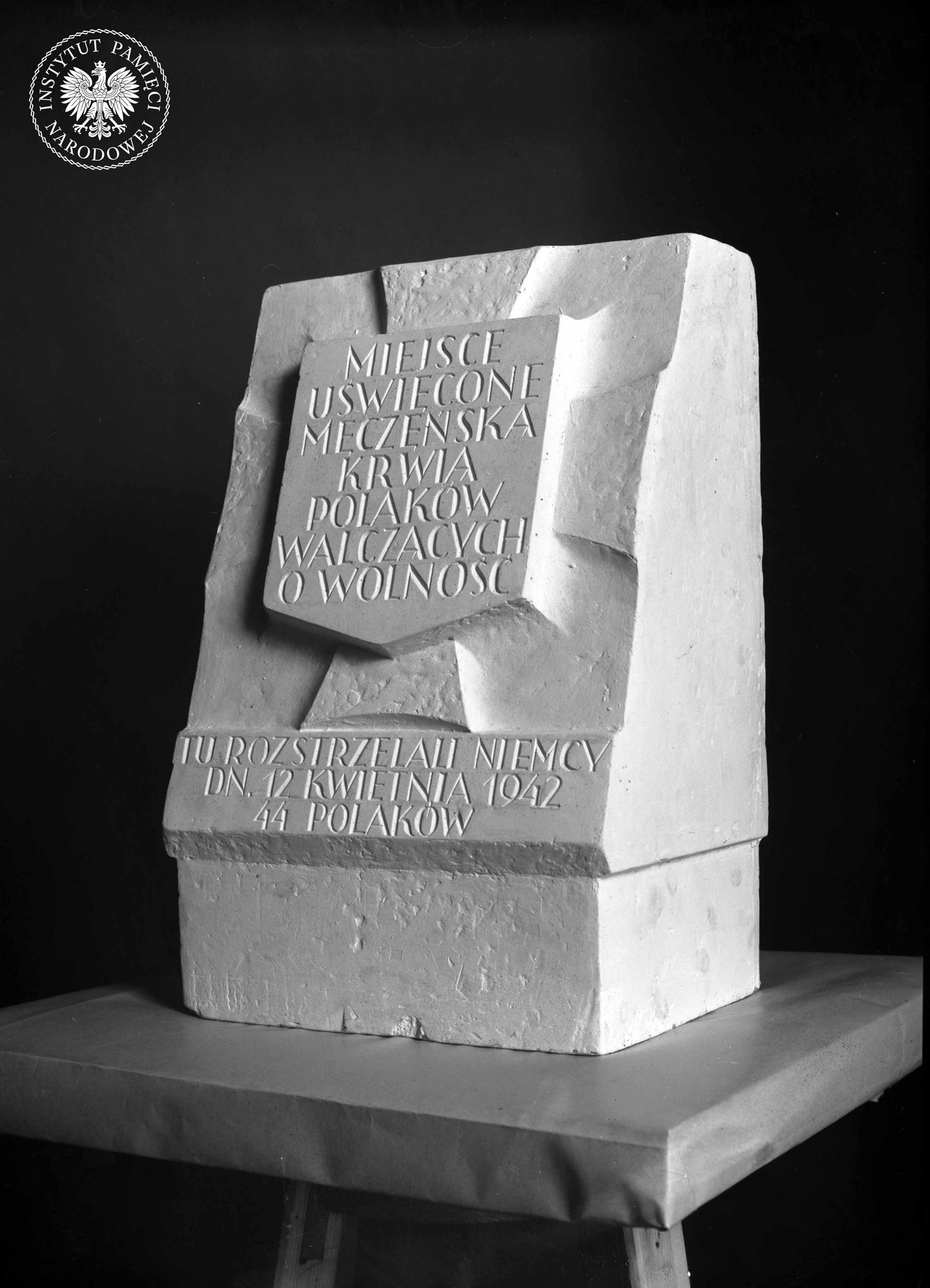 Zwycięska praca konkursowa. Model tablicy pamiątkowej autorstwa Karola Tchorka ku czci Polaków poległych w czasie okupacji niemieckiej, w formie kamiennej płyty z umieszczonym centralnie stylizowanym równoramiennym krzyżem. Pośrodku wyryty napis: „Miejsce uświęcone męczeńską krwią Polaków walczących o wolność”. Poniżej podstawy krzyża wyryty napis: „Tu rozstrzelali hitlerowcy dn. 12 kwietnia 1944 44 Polaków” (fot. z zasobu IPN)