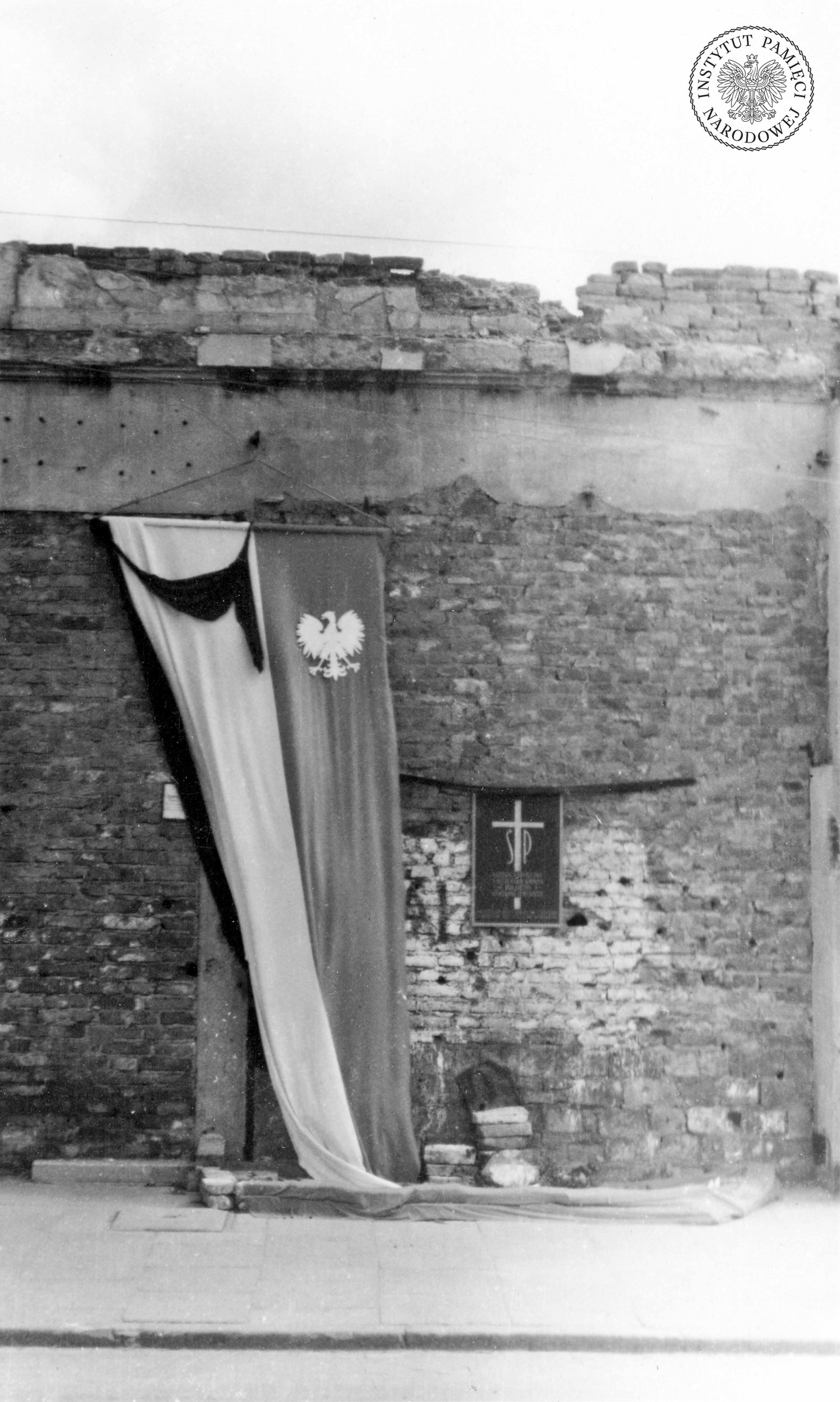 Miejsce straceń przy ul. Senatorskiej w Warszawie. Na murze widoczny napis: „Cześć 40 Bohaterom rozstrzelanym pod tym murem w lutym 1944 roku”. Po lewej czarna blaszana tablica z białym krzyżem umiejscowionym pomiędzy literami: Ś i P („świętej pamięci”). U dołu krzyża widniał napis: „Miejsce uświęcone męczeńską krwią Polaków walczących o wolność” (fot. z zasobu IPN)