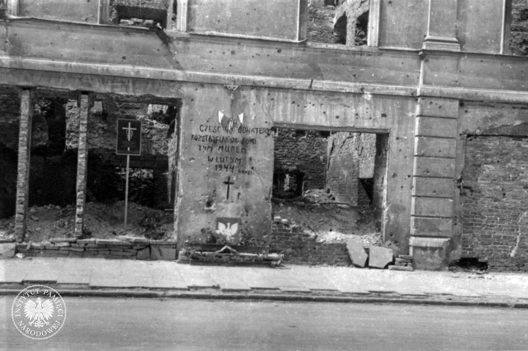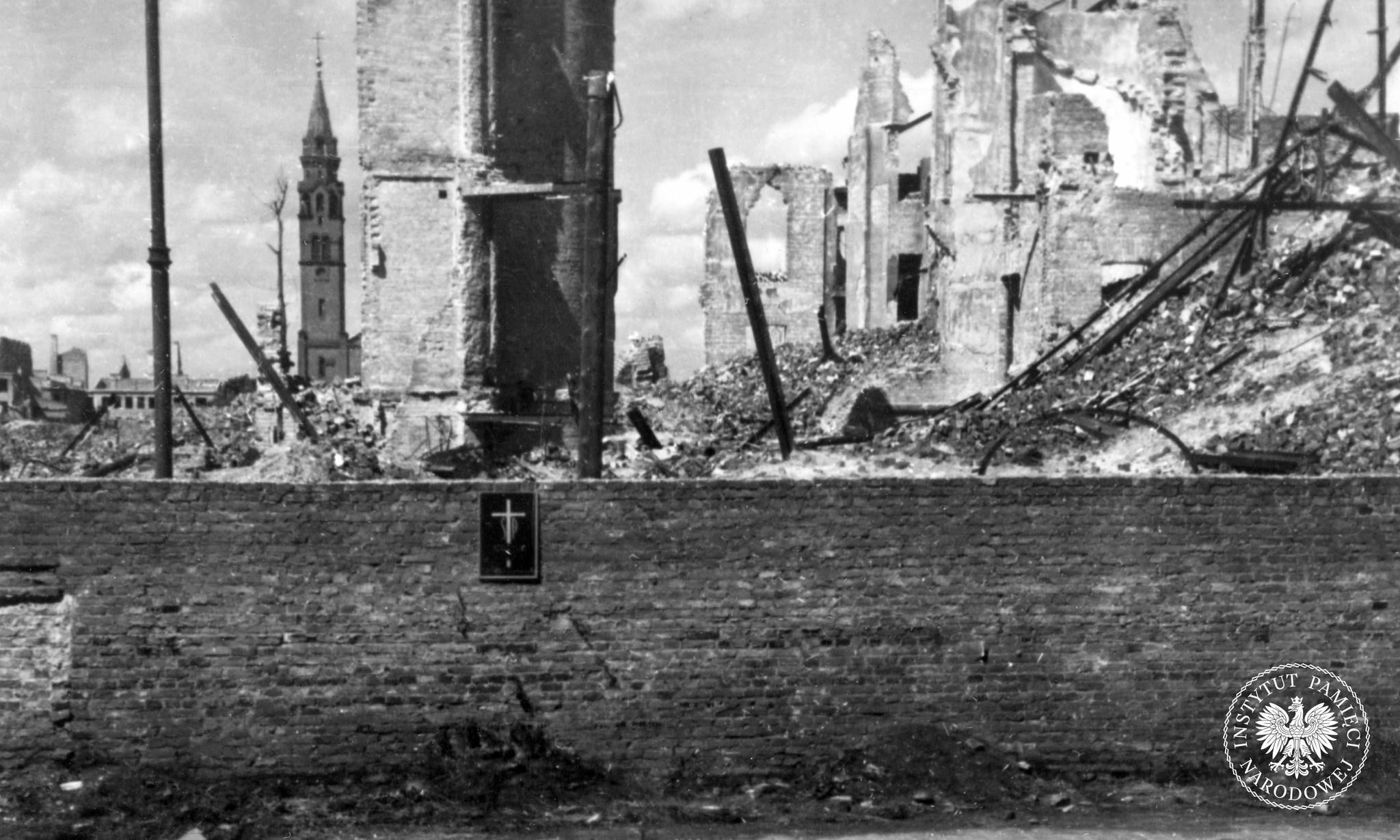Miejsce egzekucji mieszkańców Warszawy upamiętnione czarną, blaszaną płytą pamiątkową z białym krzyżem umiejscowionym pomiędzy literami: Ś i P. Zdjęcie wykonano prawdopodobnie w lipcu 1945 r. przy ul. Nowy Świat w Warszawie (fot. z zasobu IPN)
