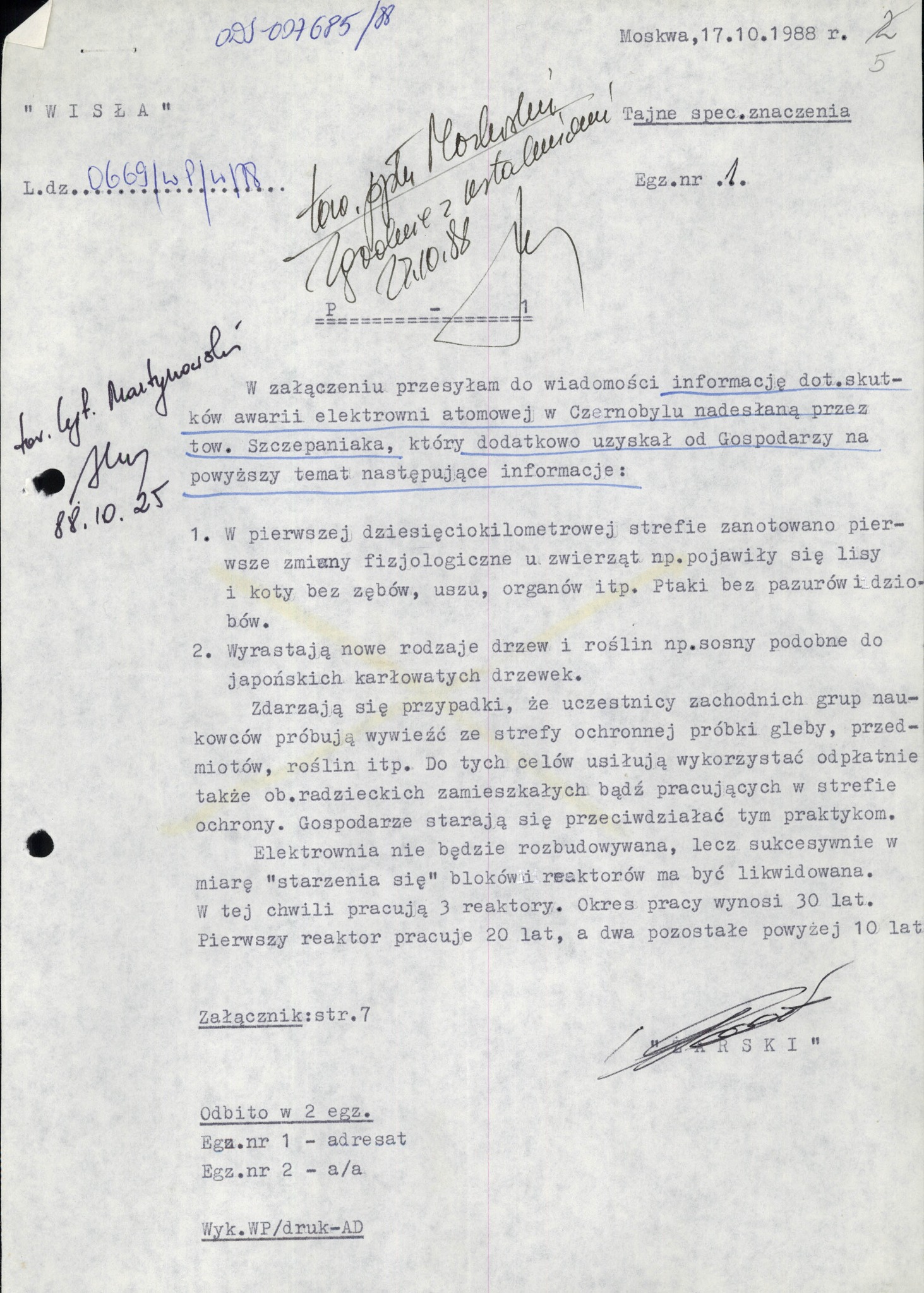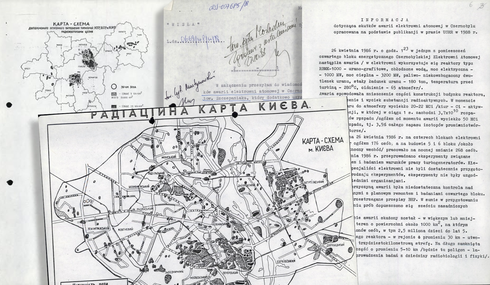 W Archiwum IPN możemy znaleźć informację z Moskwy z 17 października 1988 r. dotyczącą konsekwencji awarii w Czarnobylu, przekazaną w ramach działań Grupy „Wisła”, czyli przedstawicielstwa Departamentu II MSW PRL (kontrwywiad). Grupa „Wisła”, zajmująca się głównie nadzorem nad obywatelami polskimi przebywającymi w ZSRS, w końcu lat 80. XX w. przekazywała z polskich placówek dyplomatycznych i konsularnych za wschodnią granicą wiadomości dotyczące sytuacji społeczno-politycznej w ZSRS.