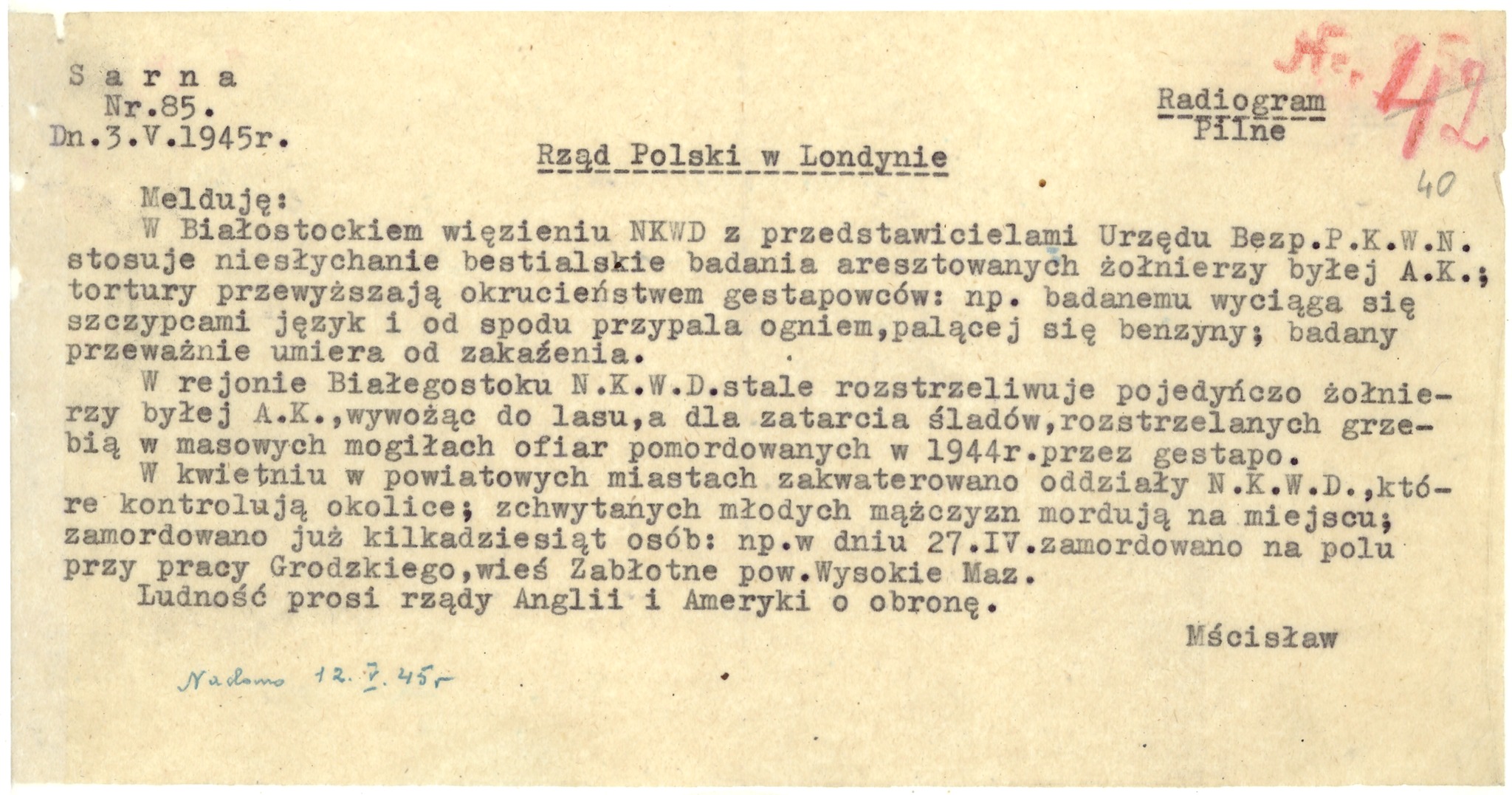 Radiogram nr 85 (datowany na 3 maja 1945 r.) Komendanta AKO krypt. „Sarna” ppłk. Władysława Liniarskiego „Mścisława” do Rządu RP na uchodźstwie (w Londynie) w sprawie aktów zbrodni popełnianych na ludności Podlasia i Mazowsza przez NKWD i UB. Dokument pochodzi ze zbioru przekazanego do zasobu IPN przez ks. Jana Domińskiego (z zasobu AIPN)