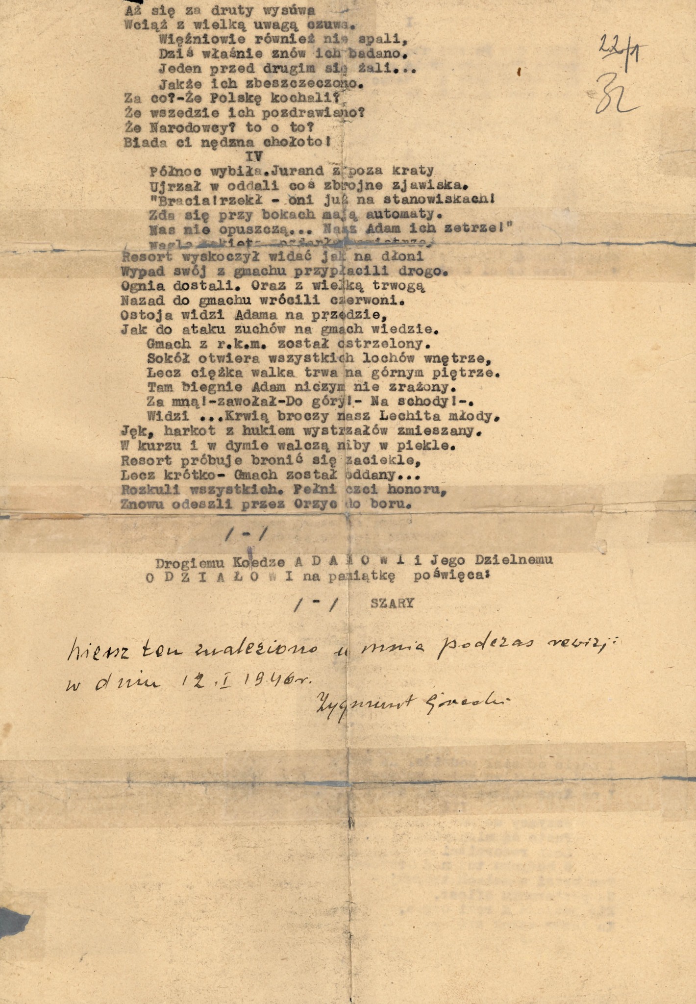 Wiersz wpadł w ręce bezpieki 12 stycznia 1946 r. po aresztowaniu Zygmunta Góreckiego.