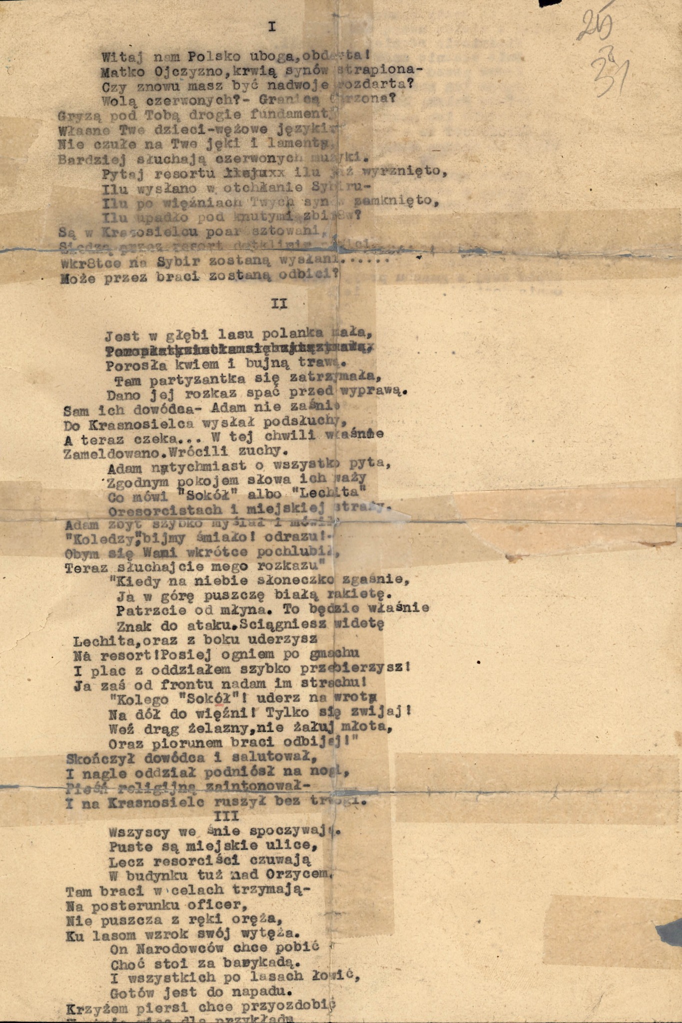 Wiersz, zakwalifikowany jako dowód rzeczowy w sprawie prowadzonej przeciwko Zygmuntowi Góreckiemu ps. Szary, został zarekwirowany w trakcie rewizji domowej przeprowadzonej 12 I 1946 r. w jego domu we wsi Morawka w pow. ciechanowskim (z zasobu IPN)
