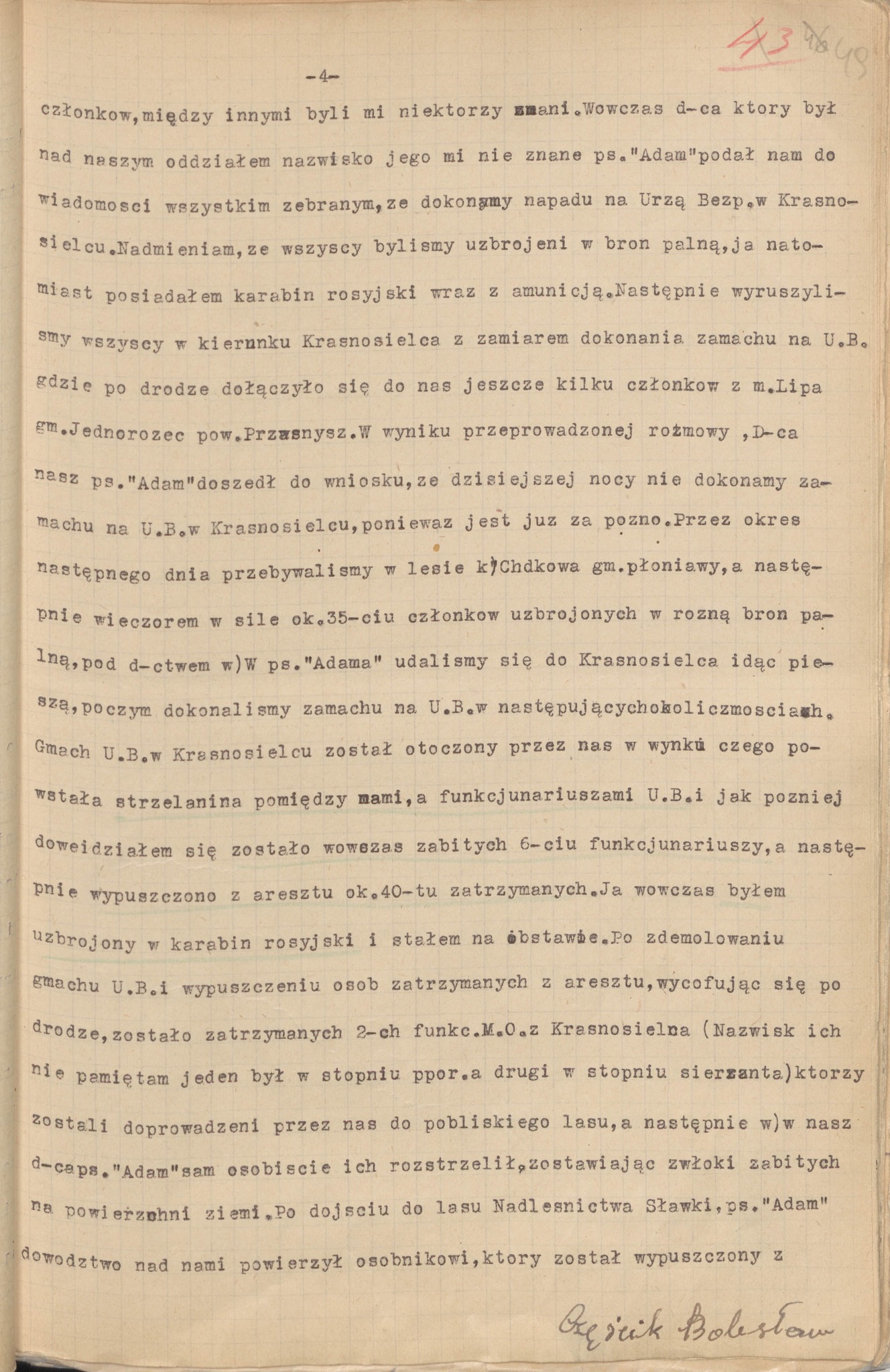 Fragment zeznań Bolesława Częścika ps. Orlik, uczestnika akcji na siedzibę PUBP w Krasnosielcu, złożonych podczas śledztwa w WUBP w Warszawie, 13 IX 1950 r. (sygn. IPN)