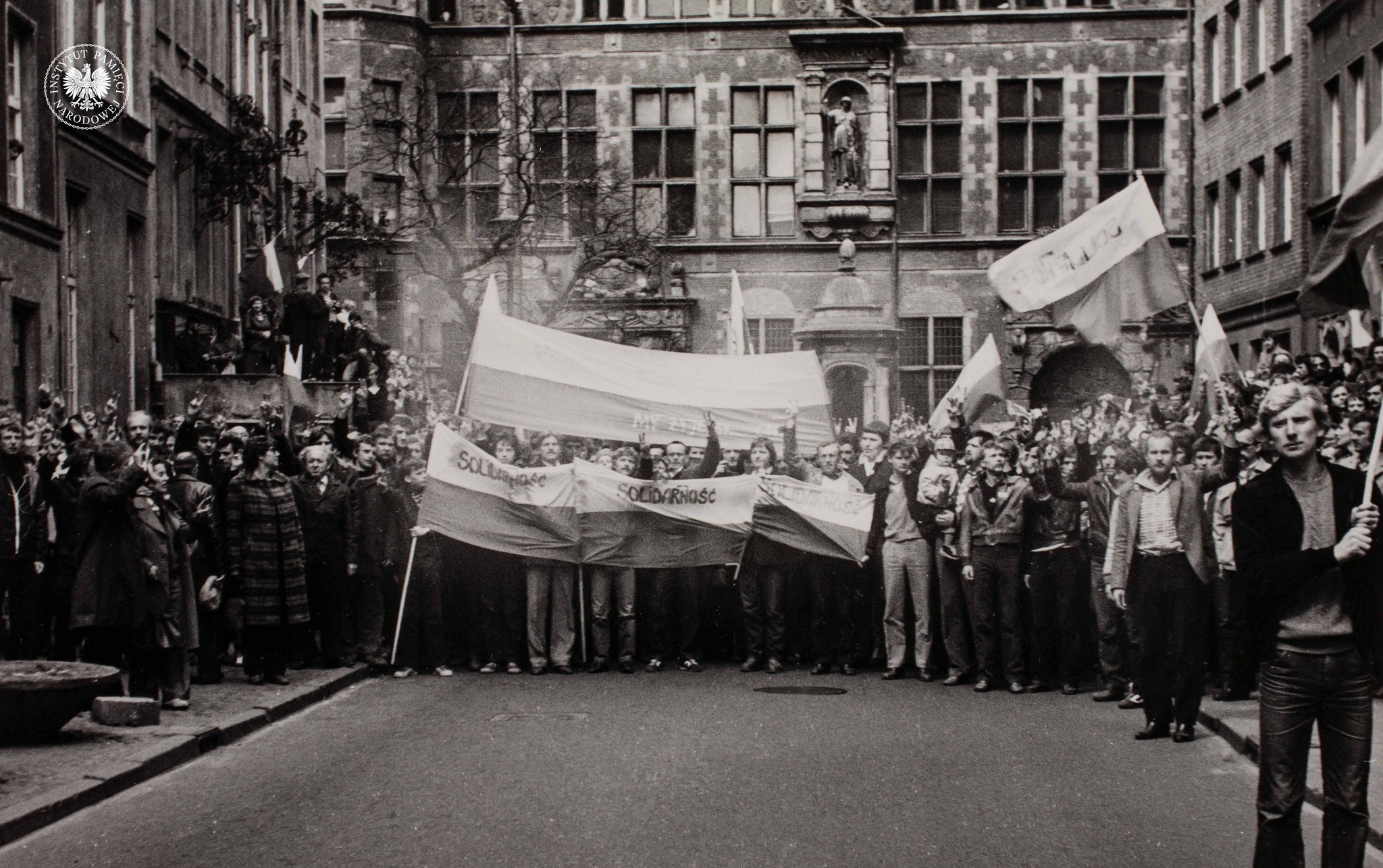 Obchody Święta Pracy zorganizowane przez podziemne struktury Niezależnego Samorządnego Związku Zawodowego „Solidarność”. Demonstranci na placu Zamkowym trzymają flagi i transparenty NSZZ „Solidarność” oraz Niezależnego Zrzeszenia Studentów (NZS). Na transparentach hasła: „SOLIDARNOŚĆ BYŁA JEST BĘDZIE”, „DYKTATURA NIE”. Warszawa, 1 maja 1982 r. (fot. z zasobu IPN)