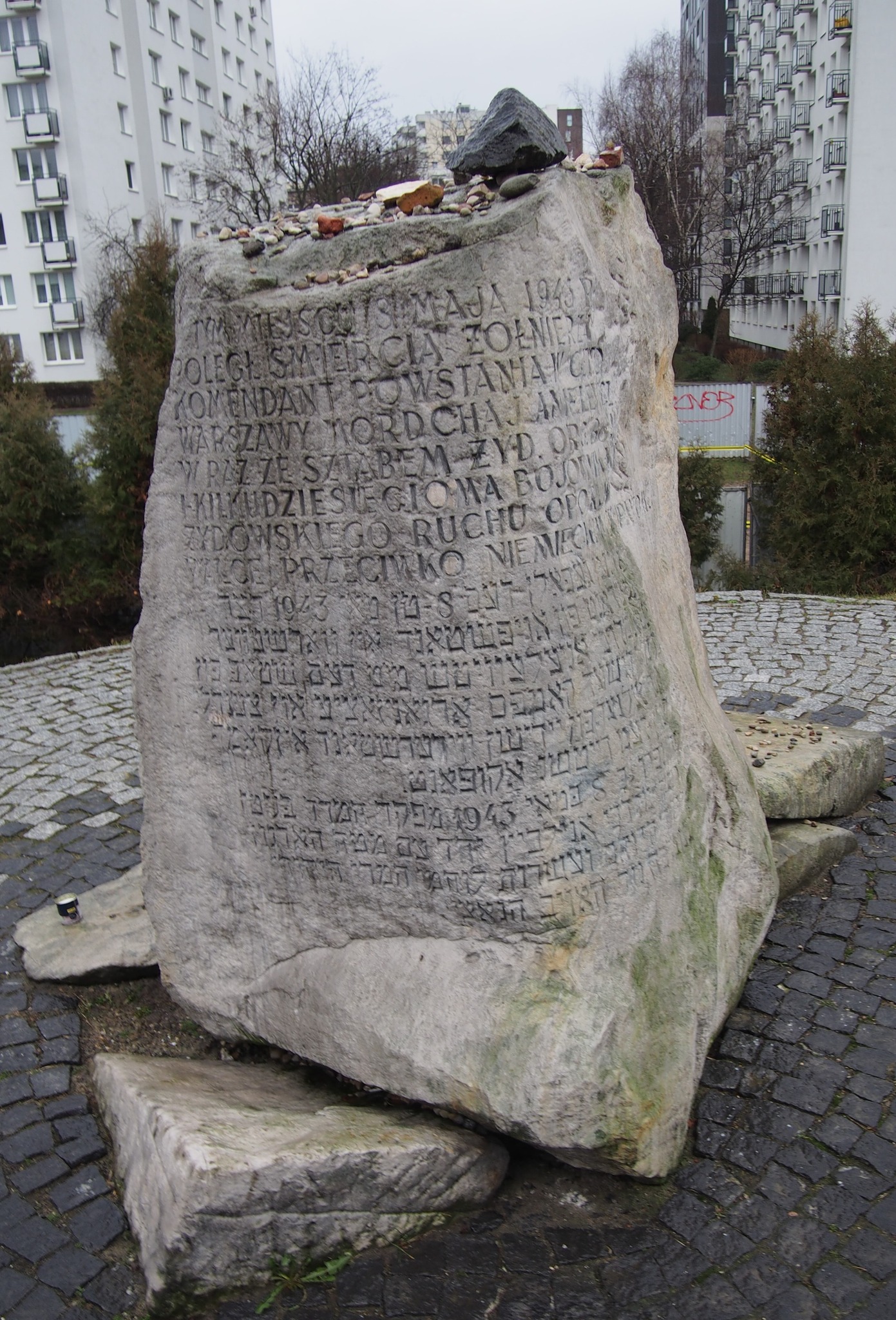 „W tym miejscu 8 maja 1943 roku poległ śmiercią żołnierza komendant powstania w Getto Warszawy Mordechaj Anielewicz wraz ze sztabem Żyd. Org. Boj. i kilkudziesięcioma bojownikami żydowskiego ruchu oporu w walce przeciwko niemieckim okupantom”.
