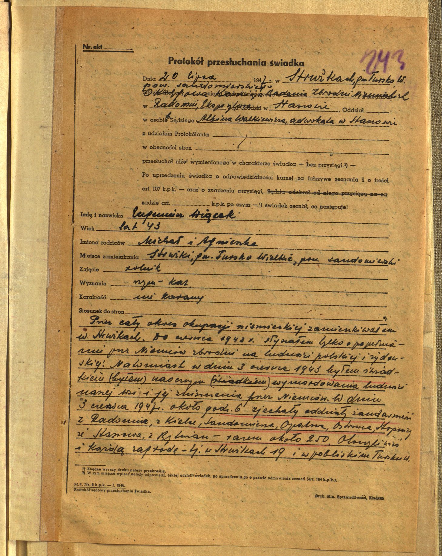 Z zachowanych relacji wynika, że w dniu pacyfikacji Strużek matka trzyletniego Stanisława, Stefania Wiącek, wyruszyła w drogę do Turska Wielkiego. Miała nadzieję, że wśród pożarów i mordów jej dzieci, przebywające pod opieką babci, przeżyły i znalazły odpowiednie schronienie. Zrozpaczonej matce towarzyszyli: mąż Eugeniusz i znajoma NN Strzelecka. W pewnym momencie cała trójka została ostrzelana przez Niemców. Mężczyzna ukrył się po jednej stronie drogi, a kobiety schowały się w życie po stronie przeciwnej. Po chwili postanowiły same ruszyć w dalszą drogę. Niedługo potem doszło do nieszczęścia. U kresu podróży, w Tursku Wielkim, zostały zatrzymane przez żandarmów, zamknięte w stodole i spalone żywcem.