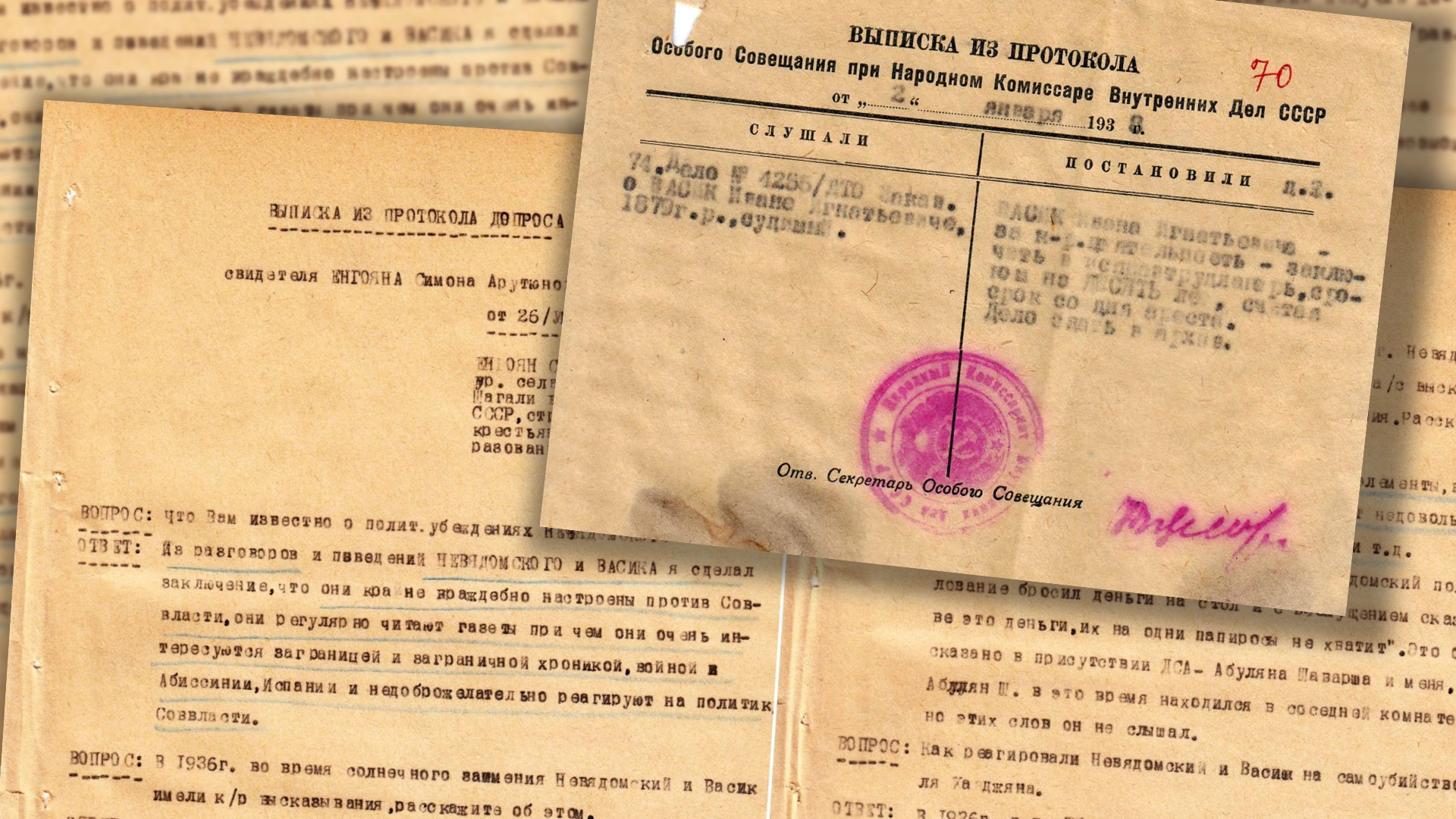 W tekście prezentujemy protokół przesłuchania Simona Arutjunowicza Jengojana, świadka w sprawie prowadzonej przeciwko Janowi Wasikowi, z 26 lipca 1937 r. oraz protokół Kolegium Specjalnego przy Ludowym Komisariacie Spraw Wewnętrznych ZSRS z 2 stycznia 1938 r., zawierający informację o skazaniu Jana Wasika na 10 lat pobytu w poprawczym obozie pracy.