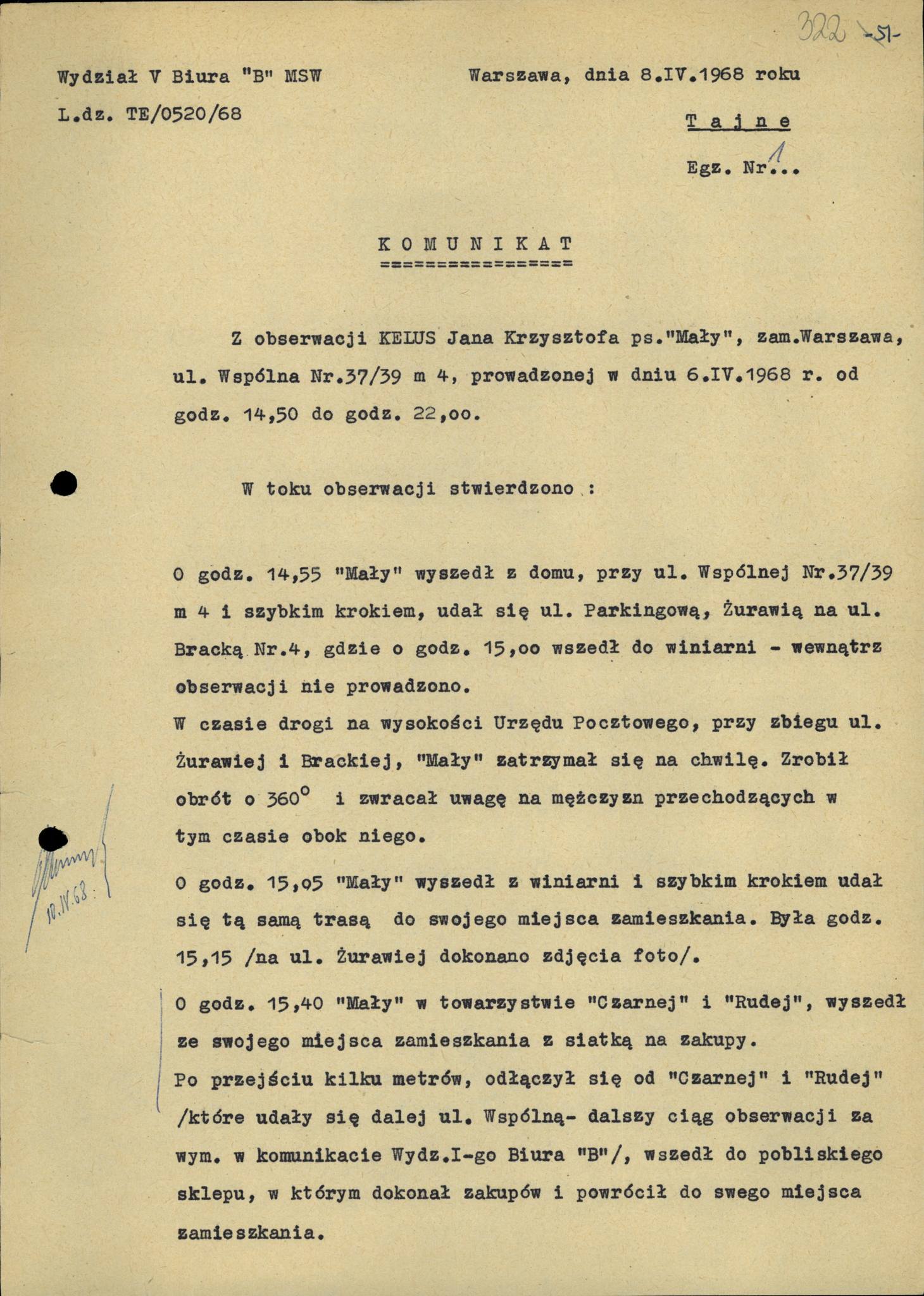 Komunikat Biura „B” MSW z obserwacji Jana Krzysztofa Kelusa w dniu 6 kwietnia 1968 r. Warszawa, 8 IV 1968 r. (sygn. IPN)