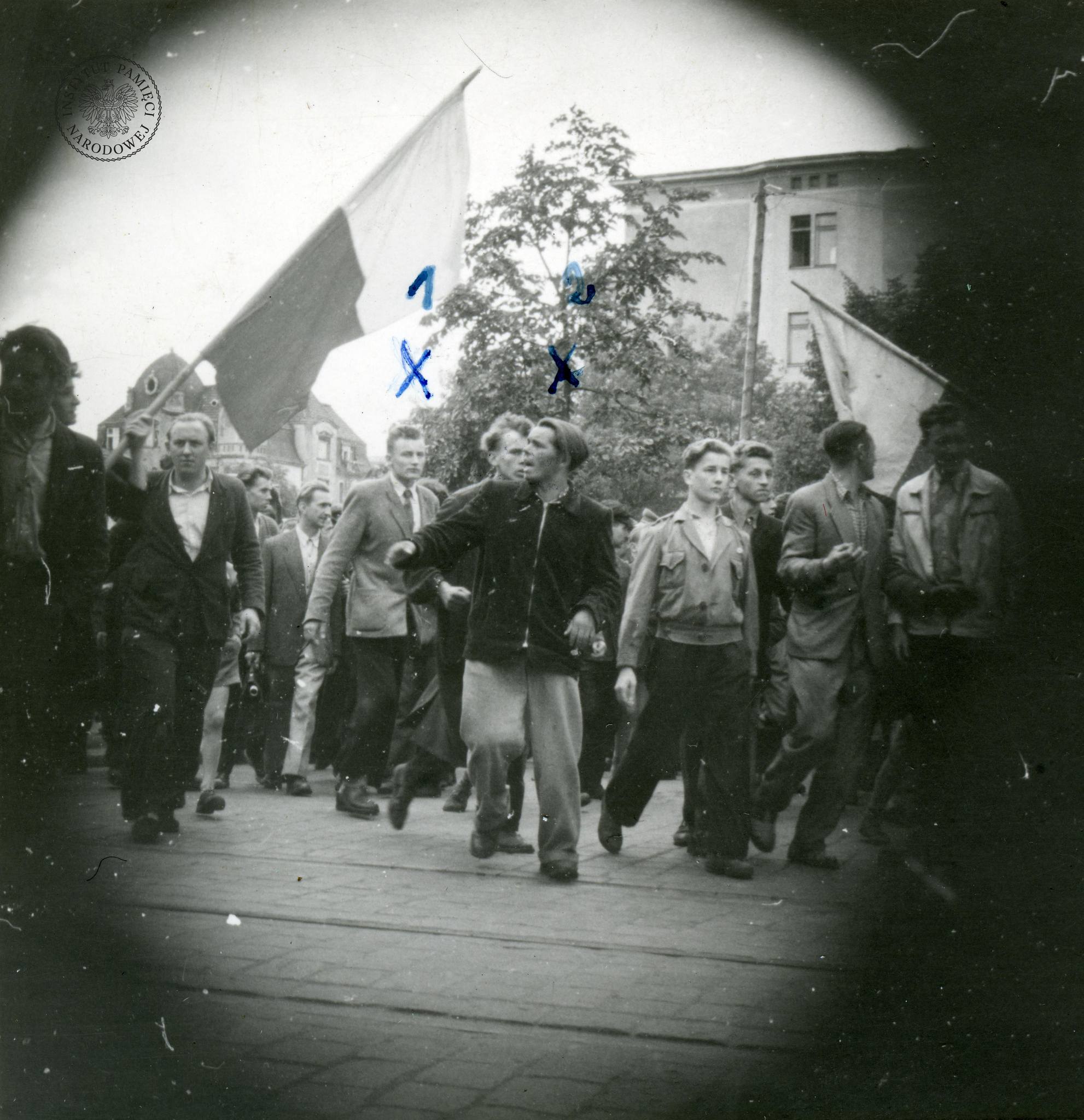 Pochód demonstrantów z biało-czerwonymi flagami prawdopodobnie na ul. J.H. Dąbrowskiego. Zdjęcie wykonane potajemnie z modelu fotograficznego - rogi zdjęcia zaciemnione. Poznań, 28 VI 1956 r. (fot. z zasobu IPN)