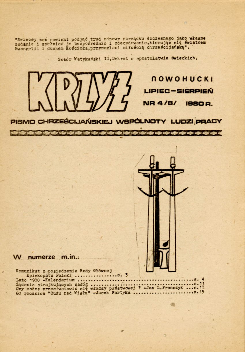 Istniejąca od ponad roku Chrześcijańska Wspólnota Ludzi Pracy w Nowej Hucie wydała 30 lipca oświadczenie, w którym, powołując się na Konstytucję PRL, Międzynarodowe Pakty Praw Człowieka, a także Konwencję nr 87 dotyczącą wolności związkowej, poparła strajkujących robotników, domagając się poszanowania wszelkich praw i godności każdego człowieka. Ponadto zażądano ujawnienia pełnej prawdy o stanie państwa, oraz rozliczenia zbrodni ludobójstwa popełnionych w czasie wojny i po jej zakończeniu. Wybrzmiała prawda o Katyniu…
