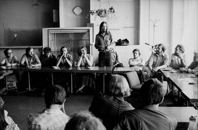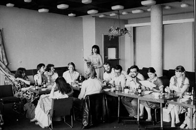 Działacze NSZZ „Solidarność” Regionu Małopolska; za stołem, od lewej Janina Gościej oraz przewodniczący Międzyzakładowego Komitetu Założycielskiego Kraków Mieczysław Gil (fot. z zasobu IPN)