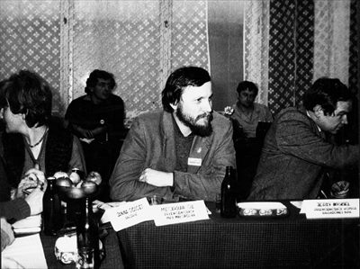 Działacze NSZZ „Solidarność” Regionu Małopolska. Przemawia Piotr Boroń. W głębi, z prawej Mieczysław Gil (3P) oraz Stanisław Góral (4P), z lewej Andrzej Hudaszek (2L) (fot. z zasobu IPN)