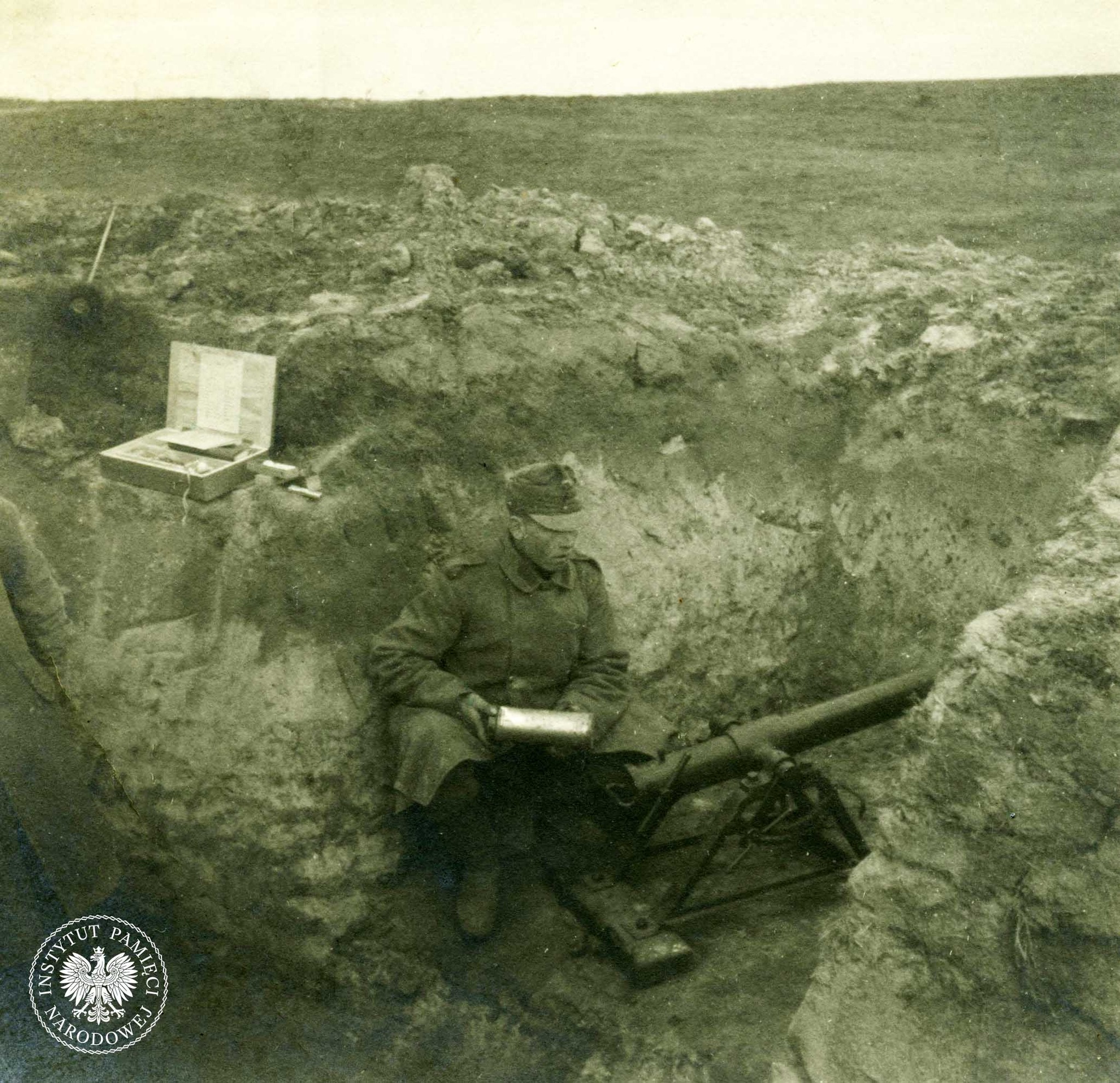 Austriacka 12 cm armata oblężnicza M.80 (czyli model z 1880 r.) Armaty takie jak ta, choć przestarzałe, pozwoliły zapewnić siłę ognia do czasu wyprodukowania nowoczesnego sprzętu. Zamiast oporopowrotnika wyposażono ją w mechanizm hydrauliczny (widoczny pod lawetą) i specjalną platformę, które ograniczały odrzut po wystrzale (fot. z zasobu AIPN)
