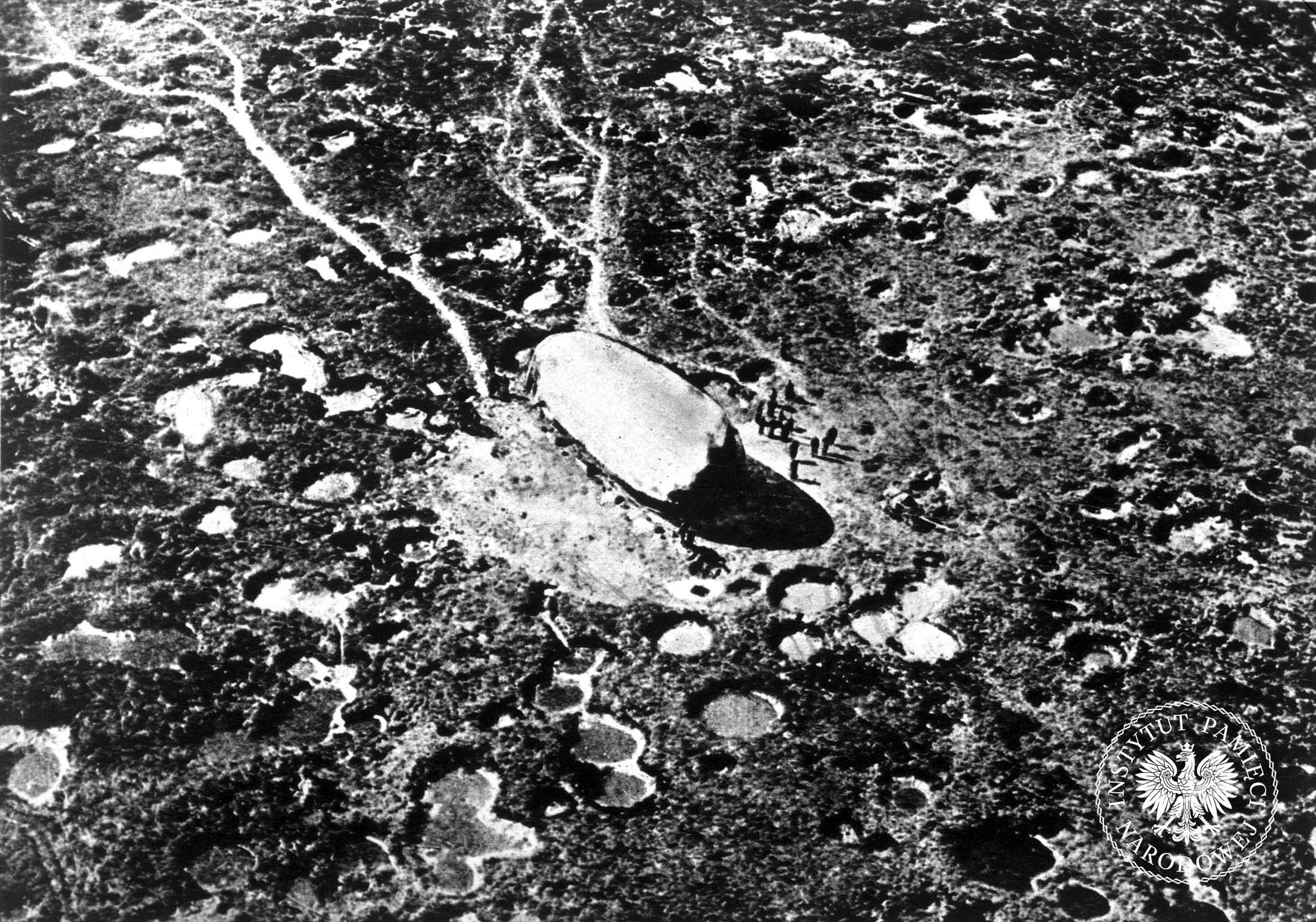 Zryte pociskami artyleryjskimi pole bitwy I wojny światowej. Artyleria powodowała nie tylko śmierć ludzi i dewastację przestrzeni, ale rujnowała też psychikę walczących. Opisano nawet nową jednostkę chorobową tzw. „szok artyleryjski” (nerwicę frontową). Wojna jednak toczy się dalej - pośród księżycowego krajobrazu widać przygotowania do podniesienia balonu obserwacyjnego (fot. z zasobu AIPN)