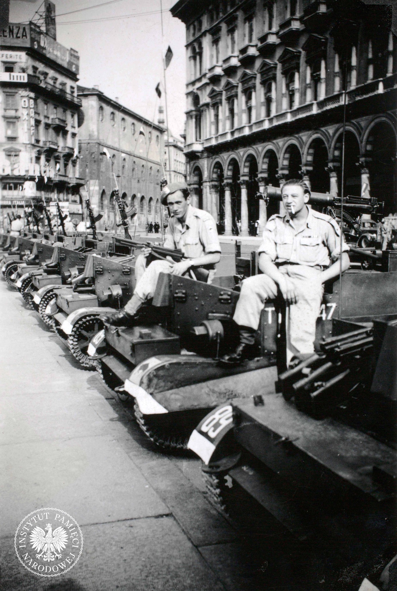 Żołnierze 4. Wołyńskiej Brygady Piechoty na Universal Carrier (brytyjskich gąsienicowych lekkich transporterach opancerzonych) przed defiladą w Mediolanie z okazji Święta Żołnierza. Mediolan, 15 sierpnia 1946 r. Zdjęcie z kolekcji kpt. Edwarda Czwaczki, przekazanej do zasobu IPN przez p. Annę Czwaczkę (fot. z zasobu AIPN)