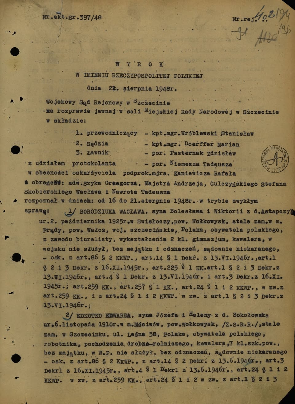 Sąd pod przewodnictwem kpt. Stanisława Wróblewskiego orzekł 6 wyroków śmierci (Wacław Borodziuk, Waldemar Klimczewski, Edward Kokotko, Edward Kosieradzki, Zenon Łozicki, Henryk Szyćko) oraz kary od dożywotniego więzienia do 1 roku utraty wolności wraz z przepadkiem całego mienia i utratą praw obywatelskich.