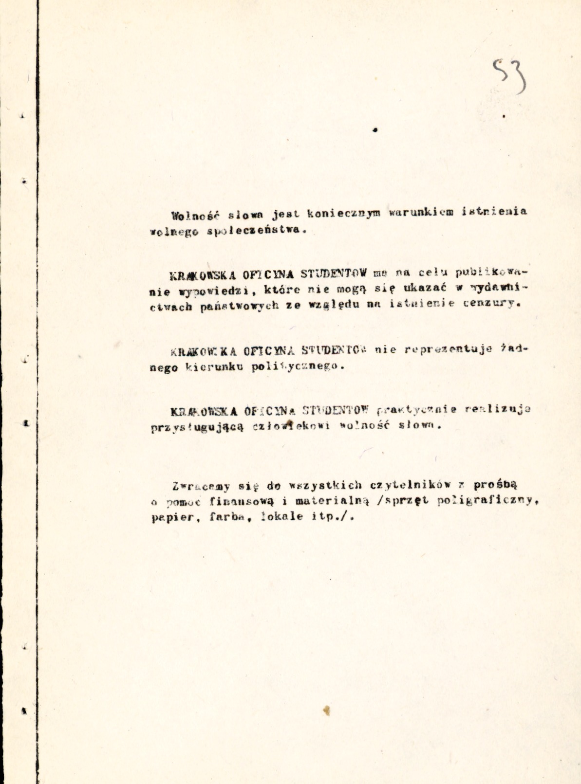 Adam Zagajewski, „List”, opr. graficzne Piotr Jaksa, Krakowska Oficyna Studentów 1979, końcowa strona redakcyjna z deklaracją celów oficyny i prośbą o wsparcie (z zasobu AIPN)